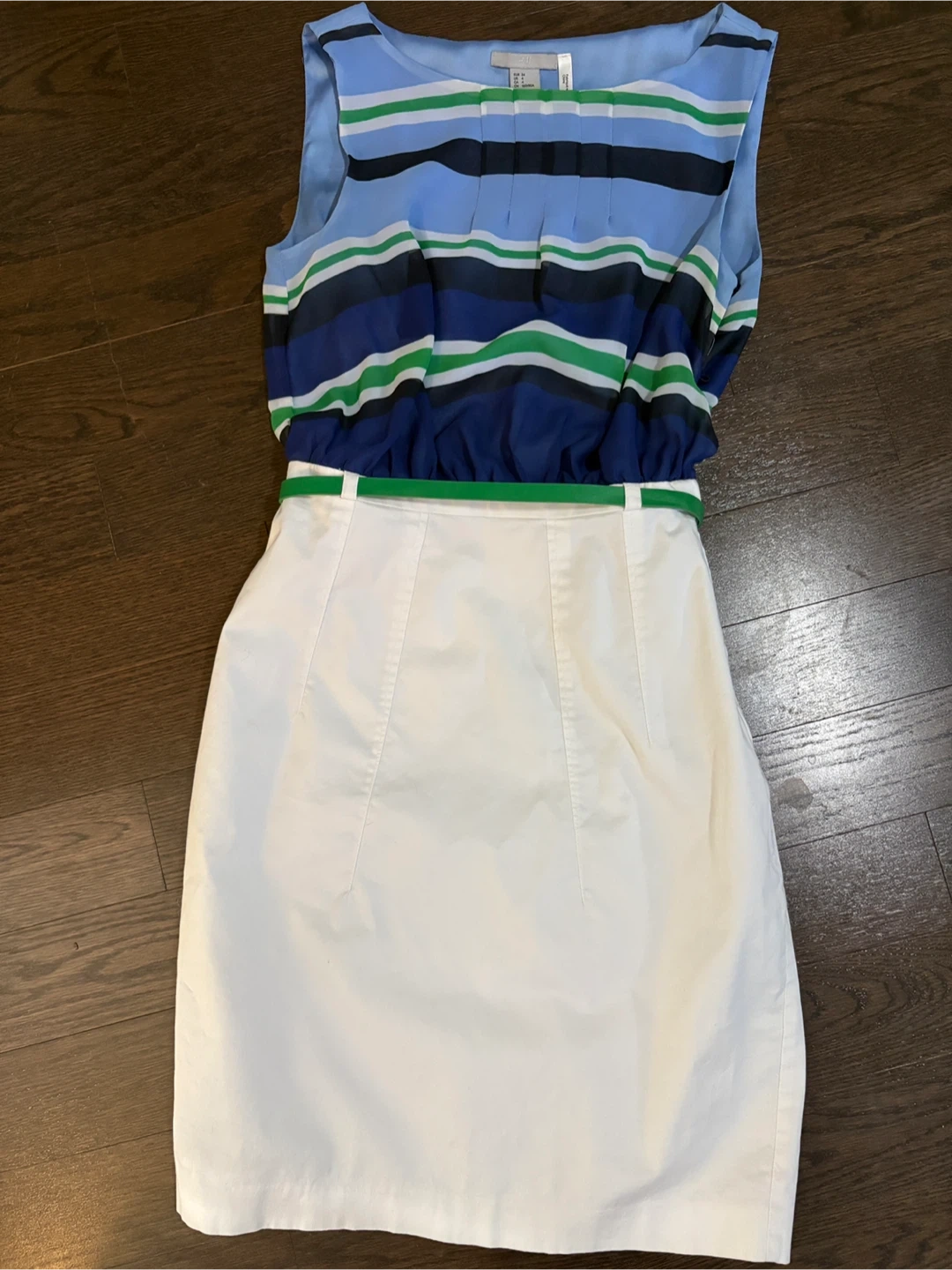 This H&M dress features a colourful striped bodice with a gathered waist. It has a crisp white A-line skirt. Excellent for warmer weather!