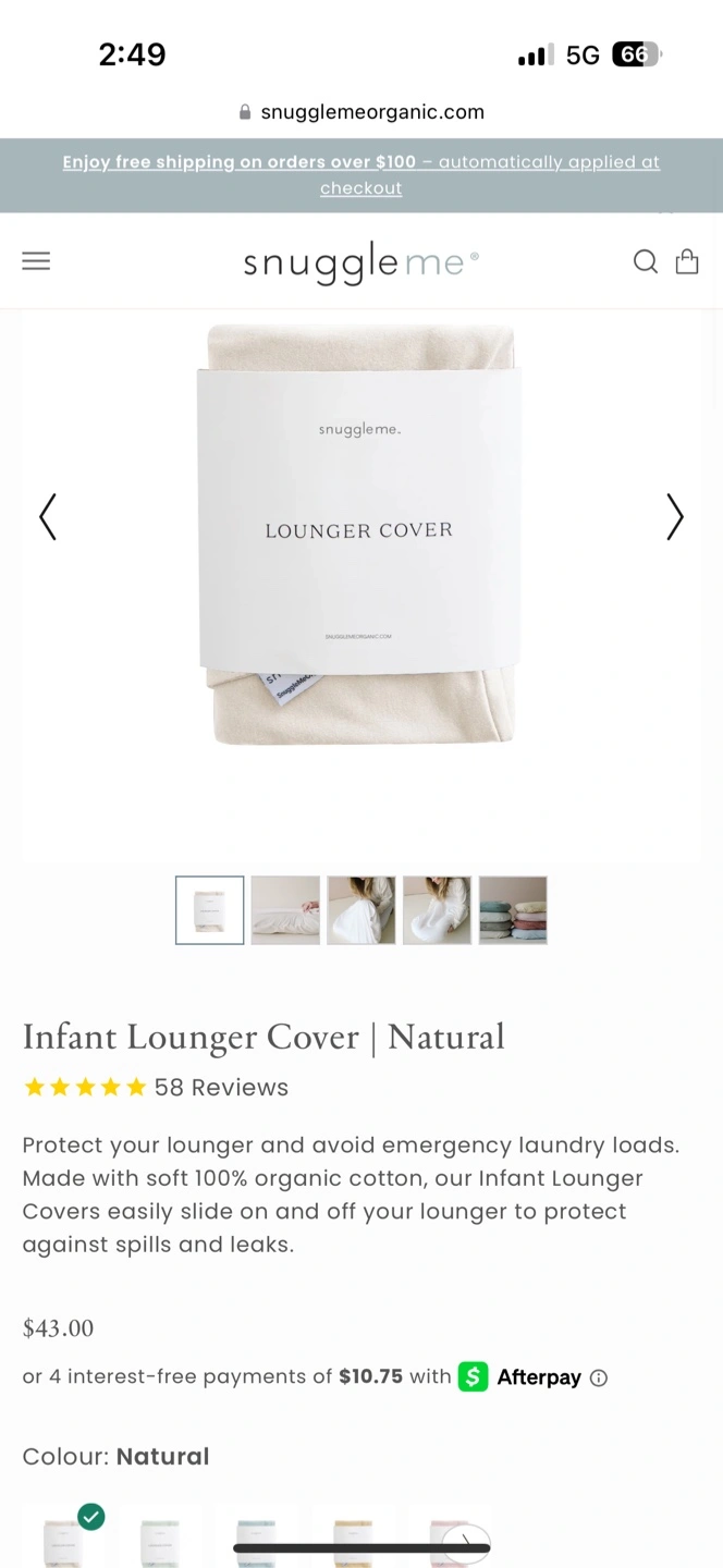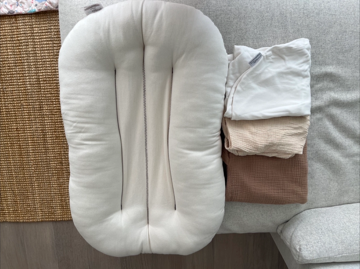Selling a Snuggle Me lounger in natural colour with 2 extra muslin covers (purchased separately).