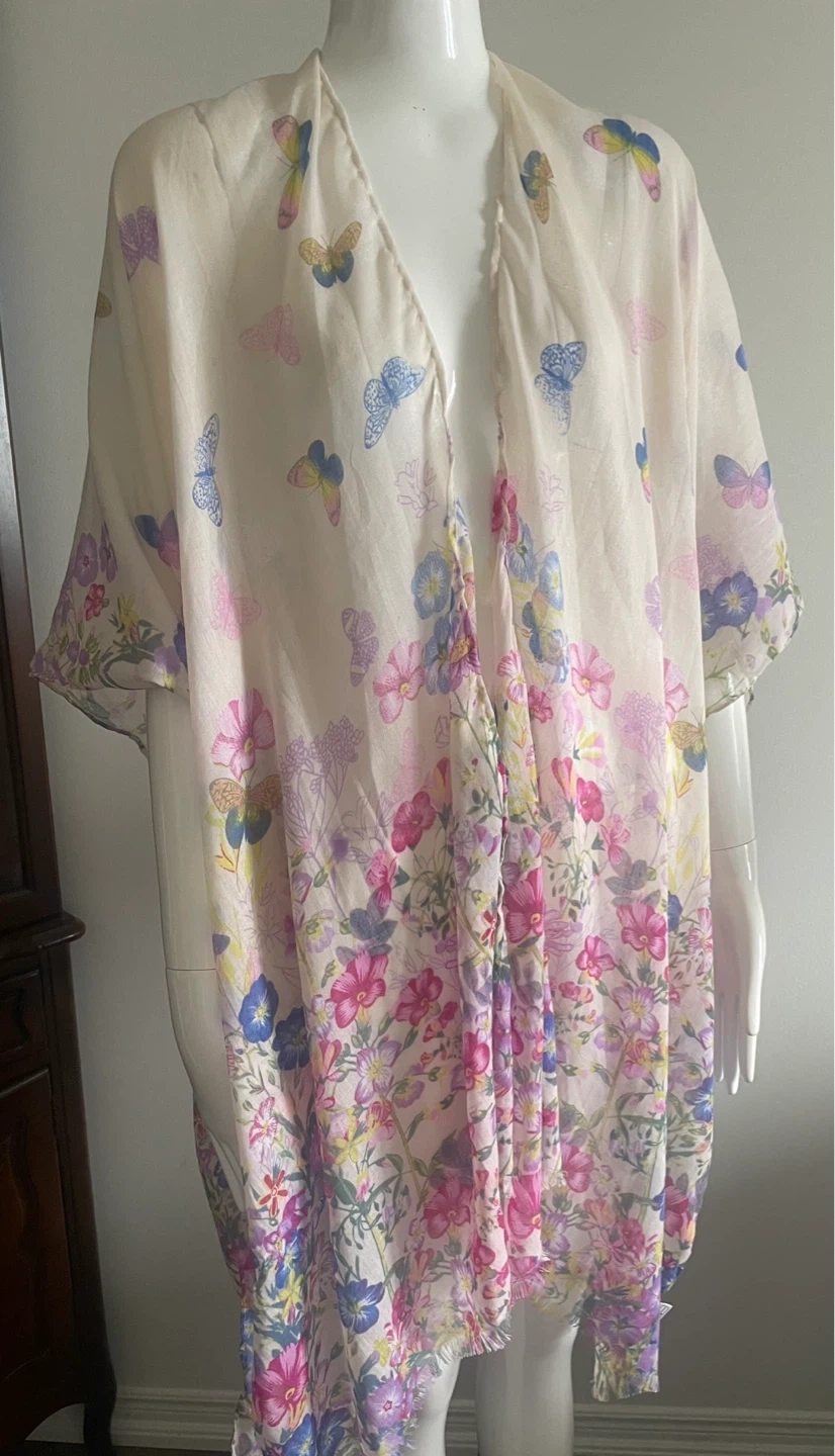 Lightweight kimono with a colourful butterfly and floral pattern. Sheer fabric with a flowy drape. Perfect for layering over outfits!