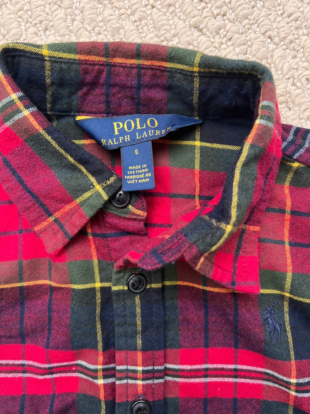 Here's a cute Polo Ralph Lauren plaid shirt for a kiddo! It's a size 6 and features a classic plaid pattern. Perfect for adding a touch of style to any outfit!