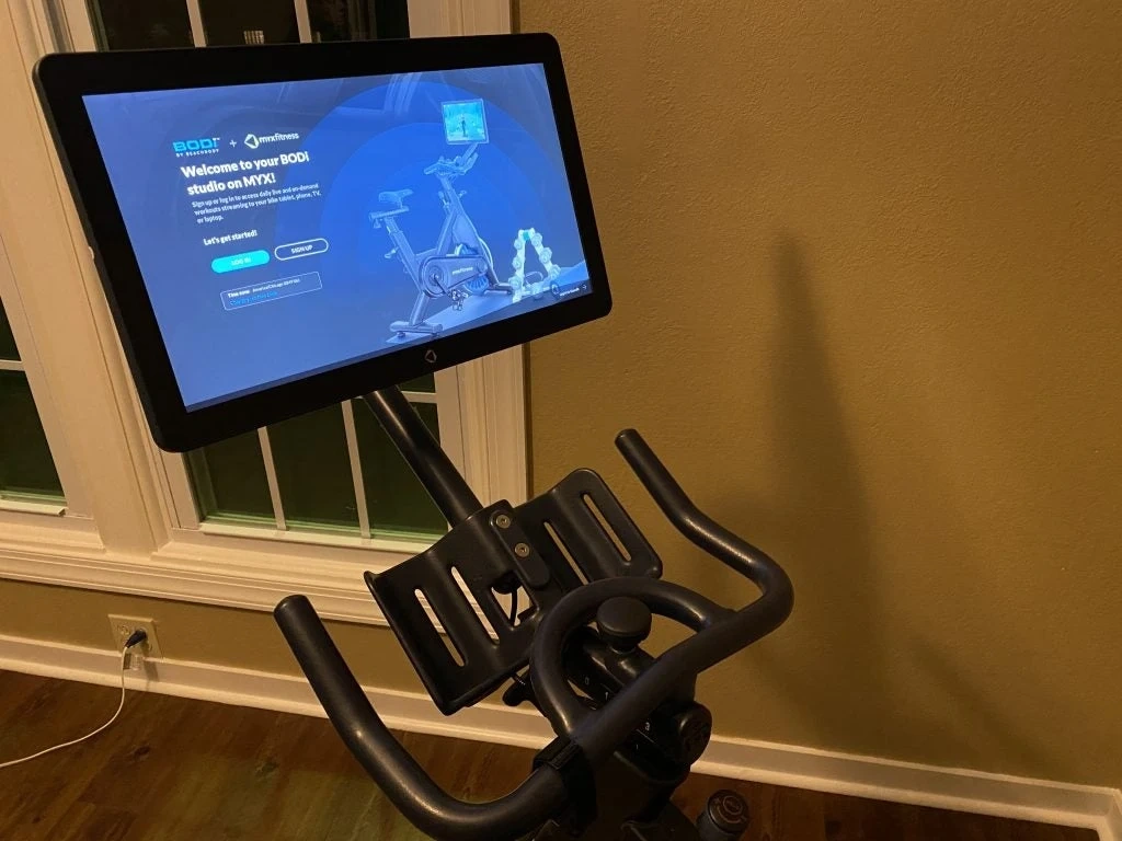 This MYXfitness stationary bike comes with a large screen for your workouts. It offers adjustable settings for a personalized ride. It's great for home fitness enthusiasts! Comes with a Polar OH1 heart rate monitor