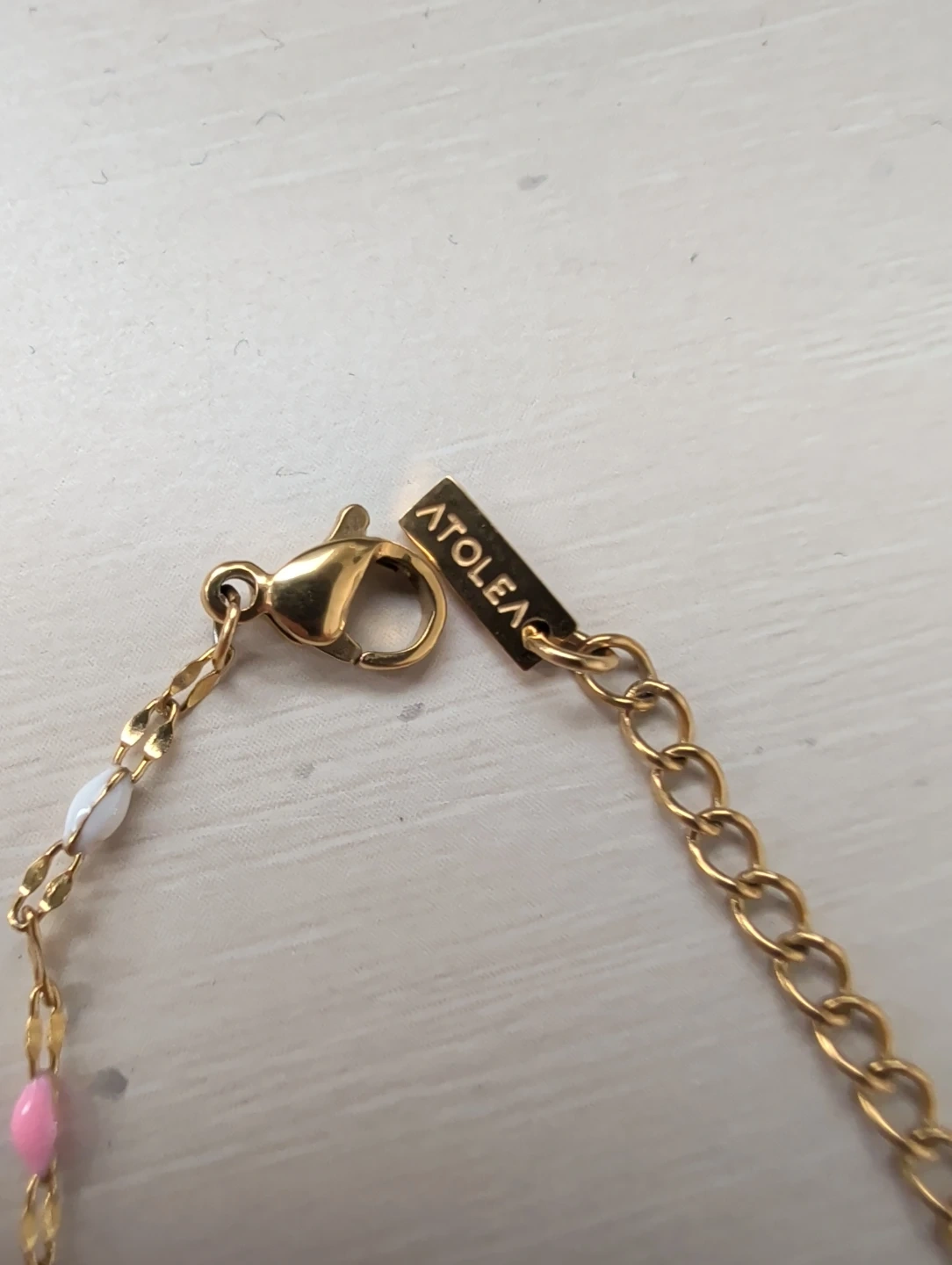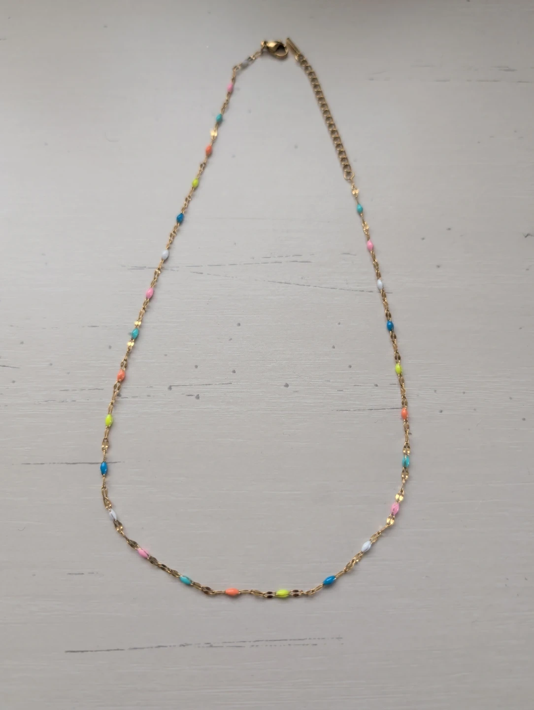 A delicate gold-tone necklace from ATolea, adorned with small, colourful enamel beads. It's adjustable for a comfortable fit. This piece adds a playful pop of colour to any outfit!