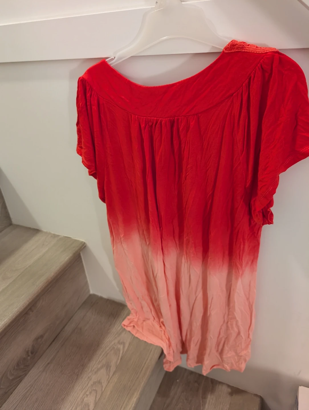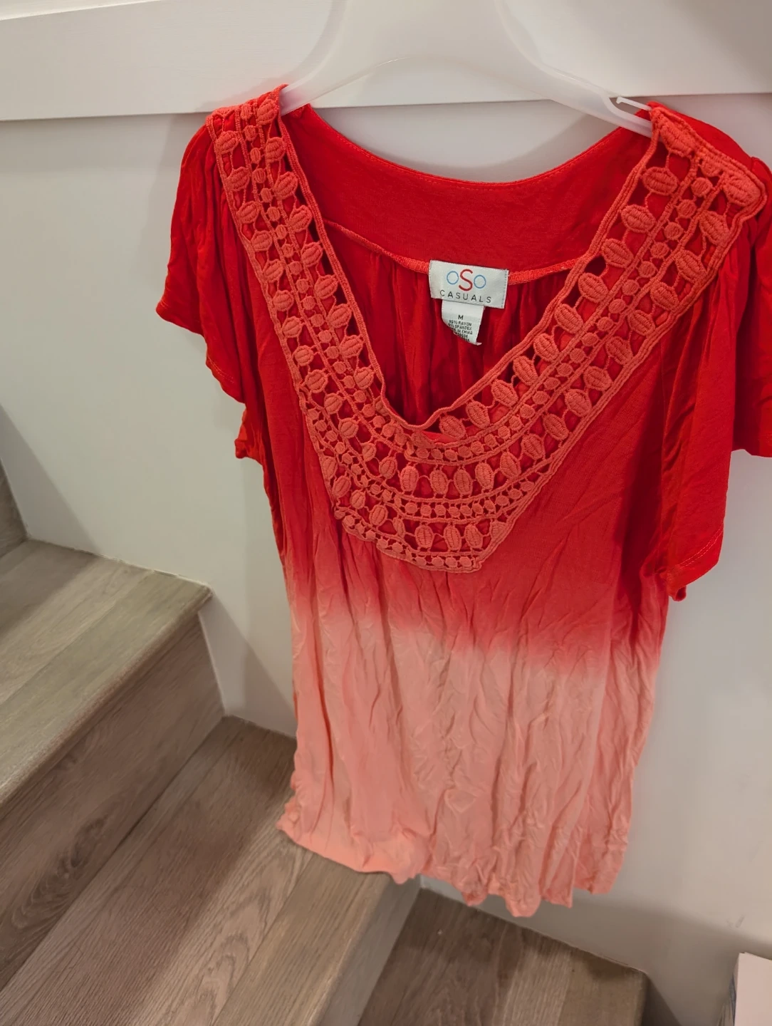 2. Coral Tie-Dye pattern with crochet detailing around the neckline with short sleeves - Size M $5