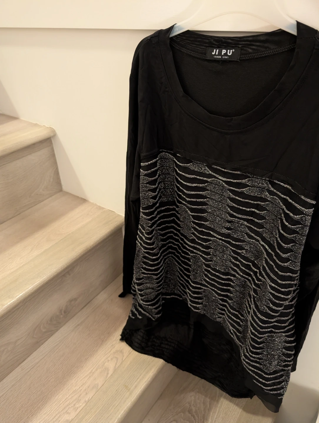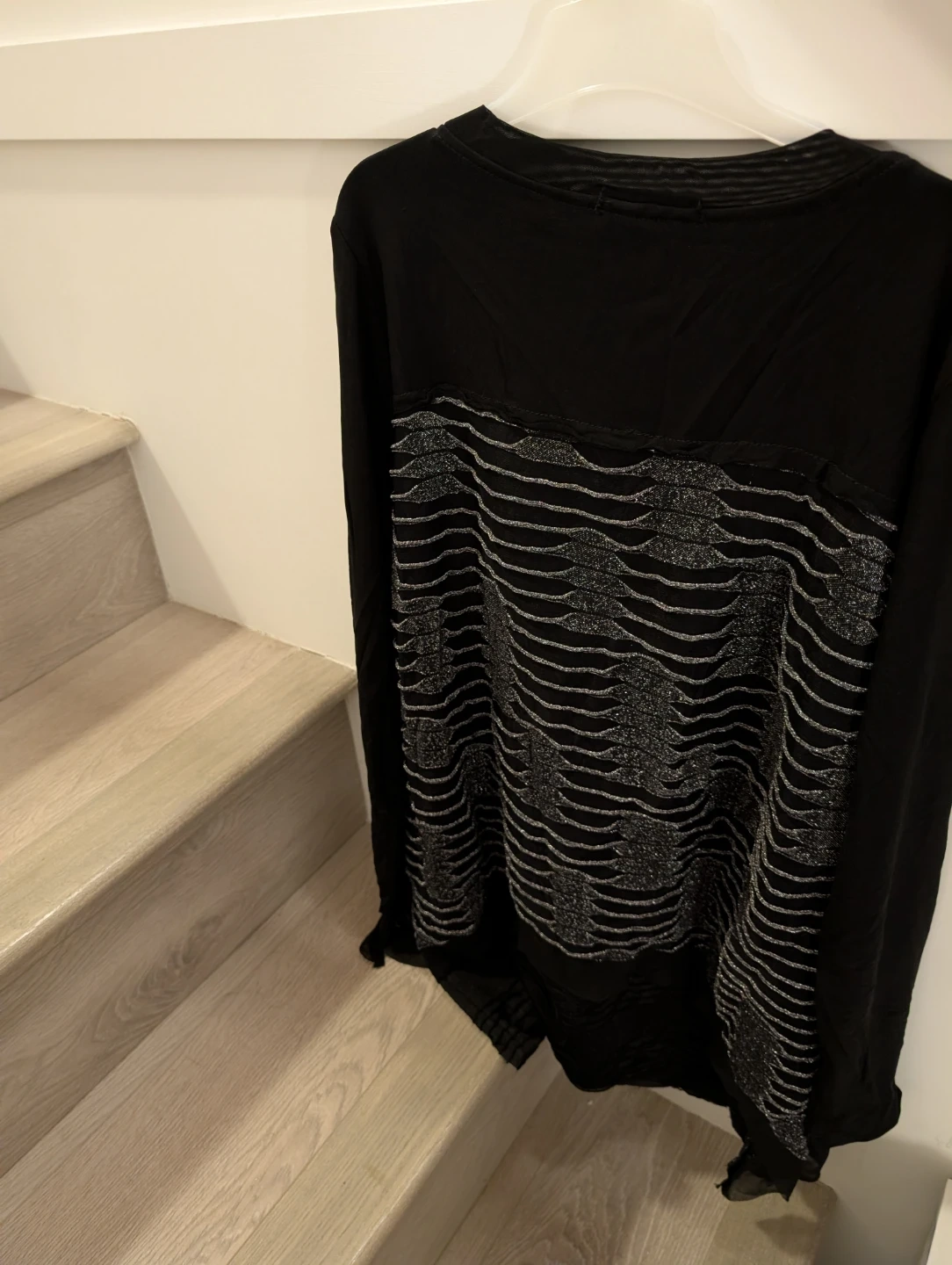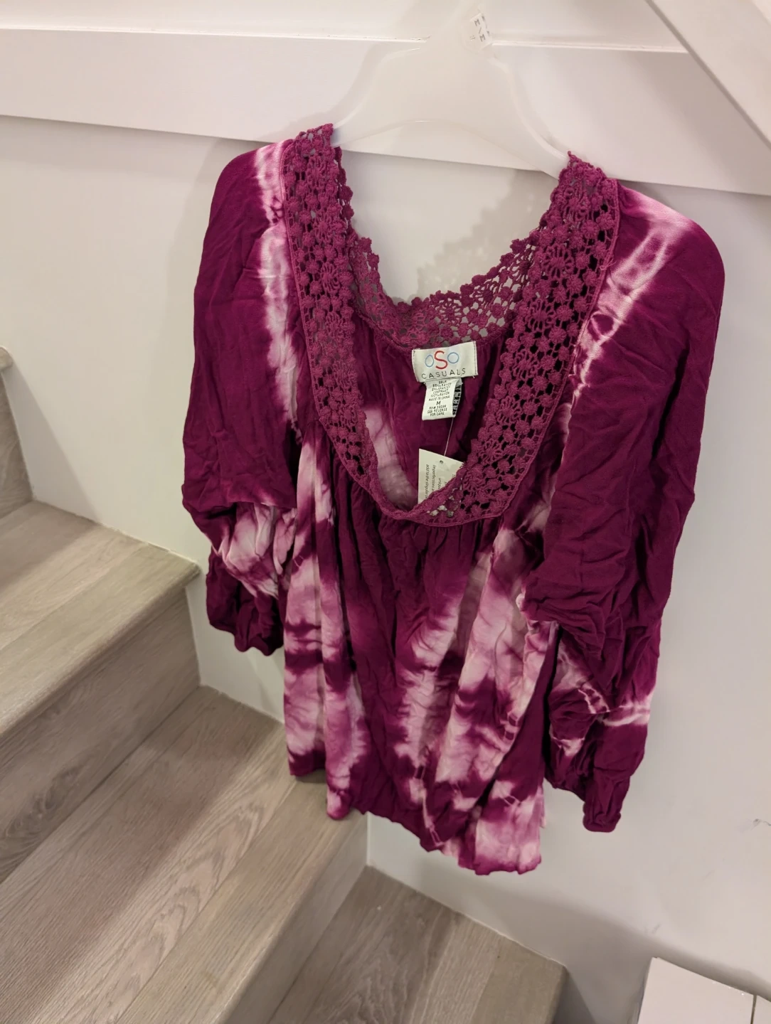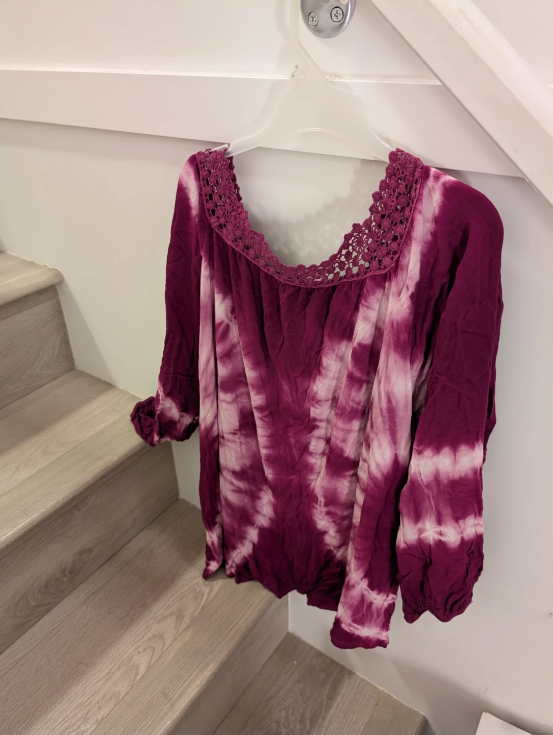 1.Purple Tie-Dye pattern with crochet detailing around the neckline with 3/4 length sleeve - Size M $5