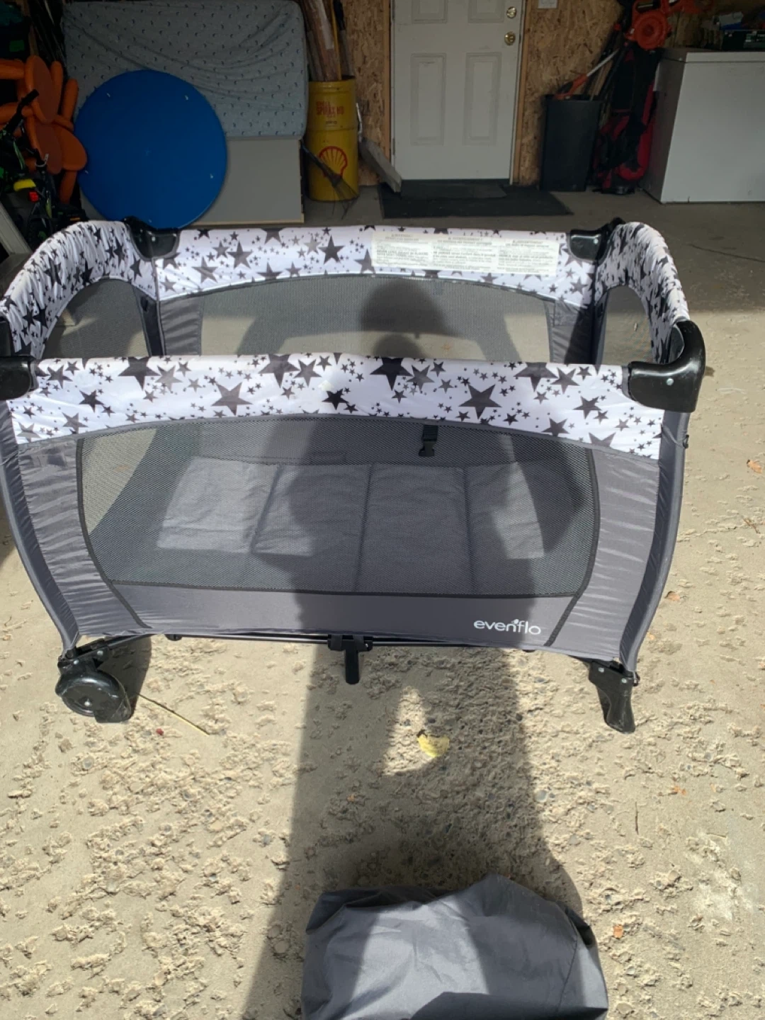 This Evenflo portable playard features a grey and black star pattern. It's easy to set up and take down for on-the-go use. The mesh sides provide ventilation. Also come with canopy.