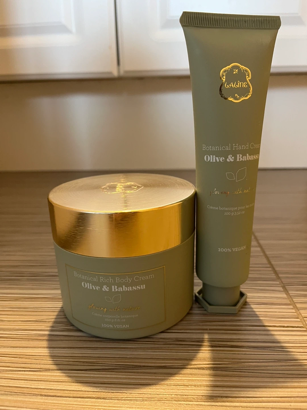 Set includes Laline Botanical Hand Cream and Botanical Rich Body Cream in Olive & Babassu scent. Both are 100% vegan. The hand cream is 100 g/3.5 oz and the body cream is 200 g/6.8 fl oz. Perfect for keeping skin moisturized!