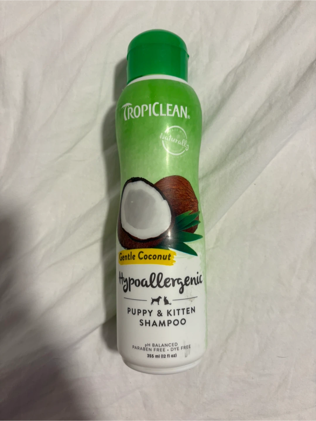 TropiClean Gentle Coconut Hypoallergenic Puppy & Kitten Shampoo. It's pH balanced, paraben free and dye free. This shampoo comes in a 355 ml (12 fl oz) bottle. It's made for puppies and kittens!