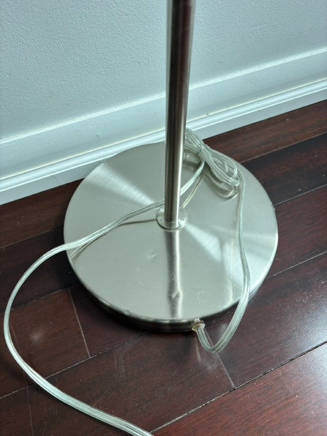 A stylish silver arc floor lamp with a flexible gooseneck head for adjustable lighting. Includes one CFL bulb. Brushed metal finish.