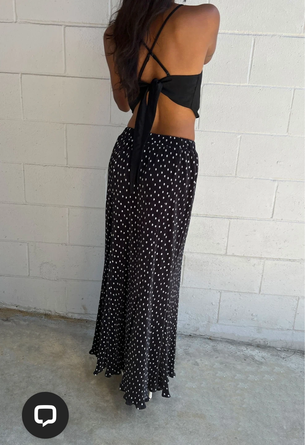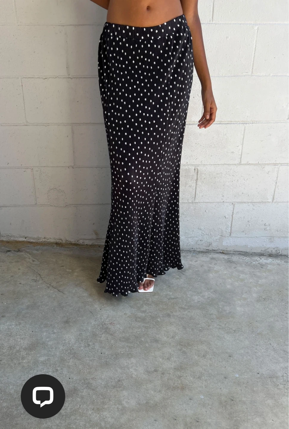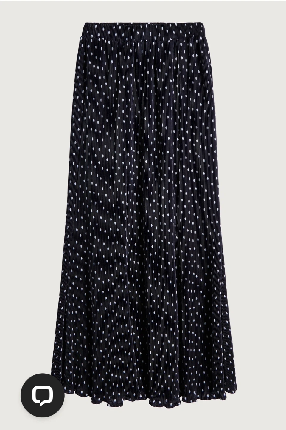 This maxi skirt has a polka dot print and is made from a pleated fabric. It has a relaxed fit with an elastic waistband. Wear yours with a cropped tank for a summery look.