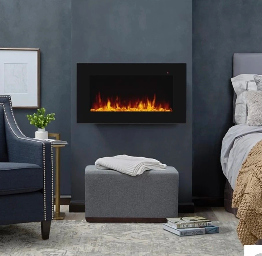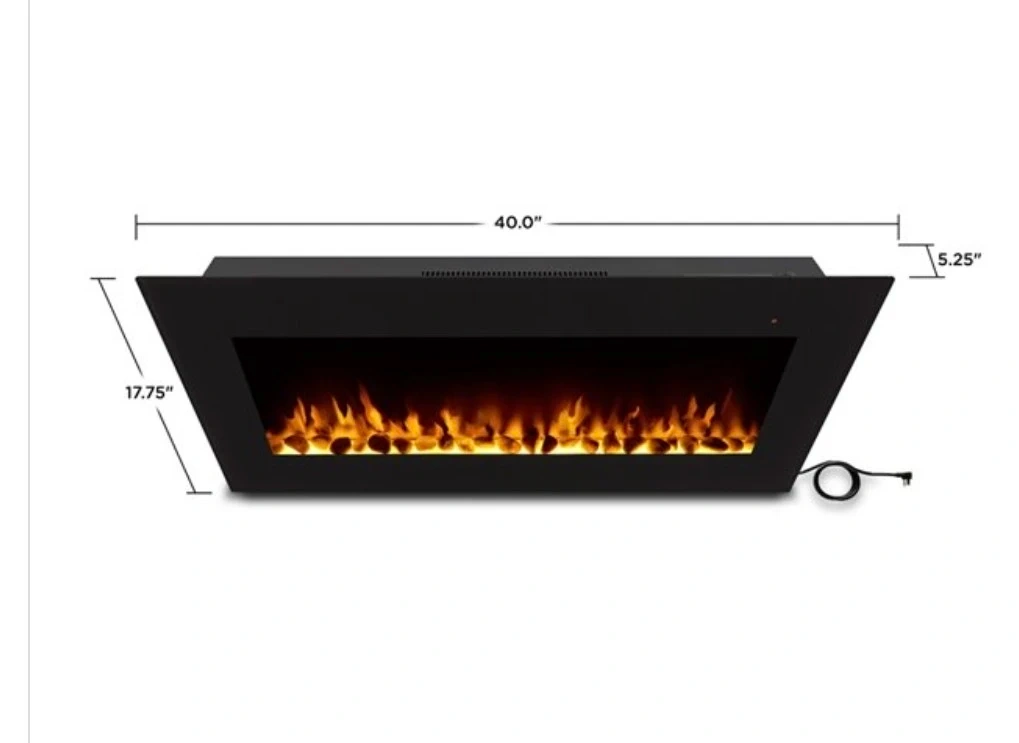 Wall-mount electric fireplace with realistic flame effect. Dimensions: 40.0" W x 17.75" H x 5.25" D. Rated at 120V, 60Hz, 1400W. Includes power cord. Certifications: ETL, FC.