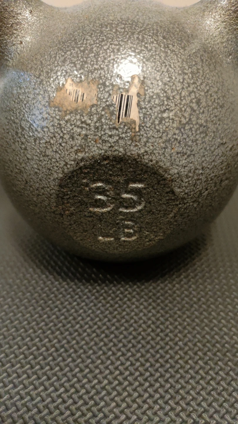Cast iron kettlebell weighing 35 pounds. Textured grip for secure handling. Suitable for strength training and conditioning exercises.