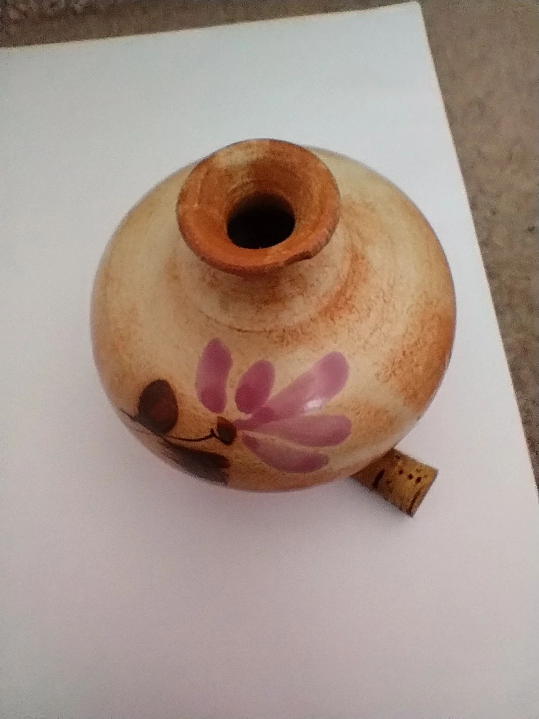 This has a unique spherical body. It features a hand-painted pink flower design with brown accents. A cork stopper is included for the spout.