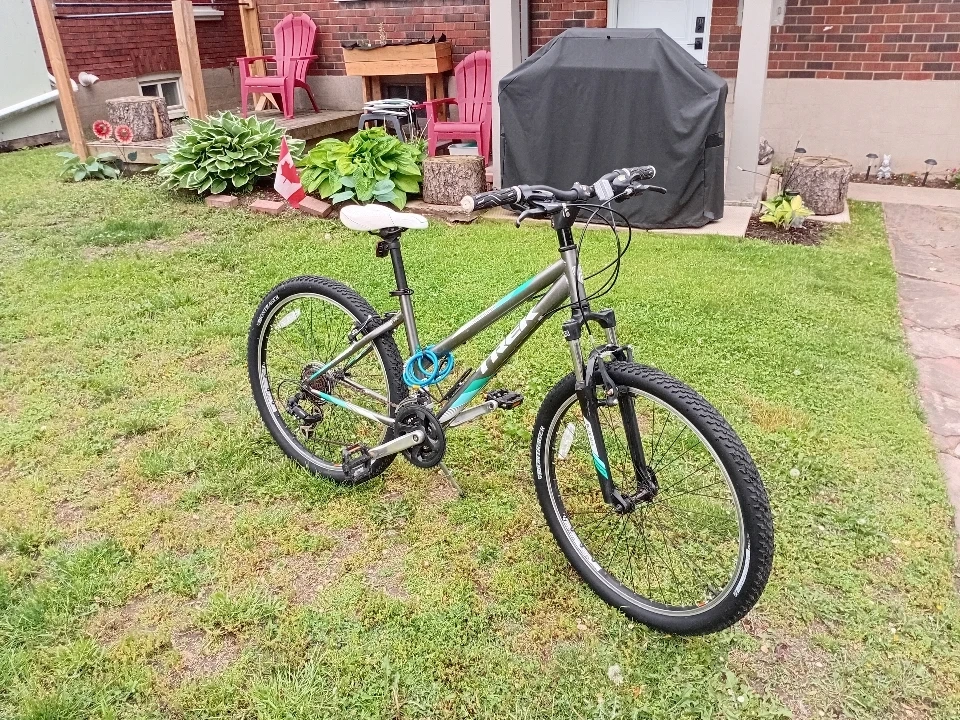 Grey and teal Trek 820 mountain bike with 27.5-inch wheels. Features a durable aluminum frame and suspension fork. Ready for your next adventure!