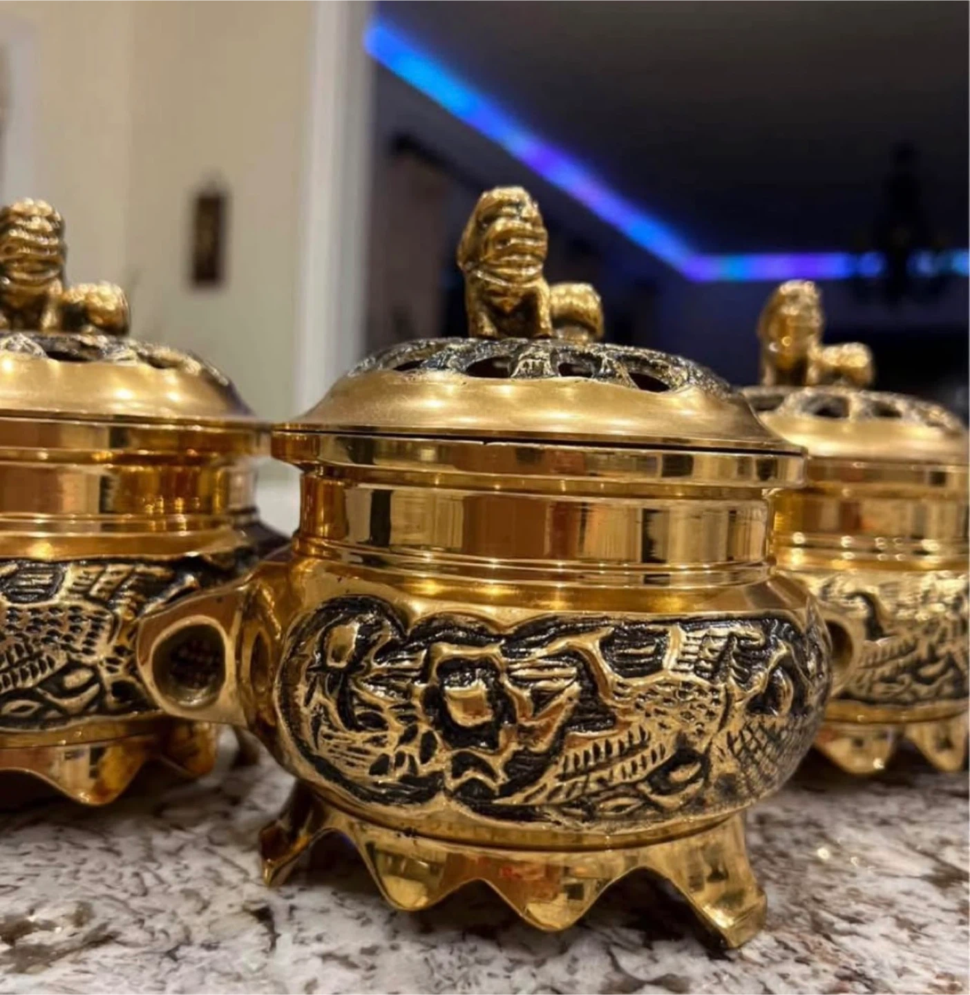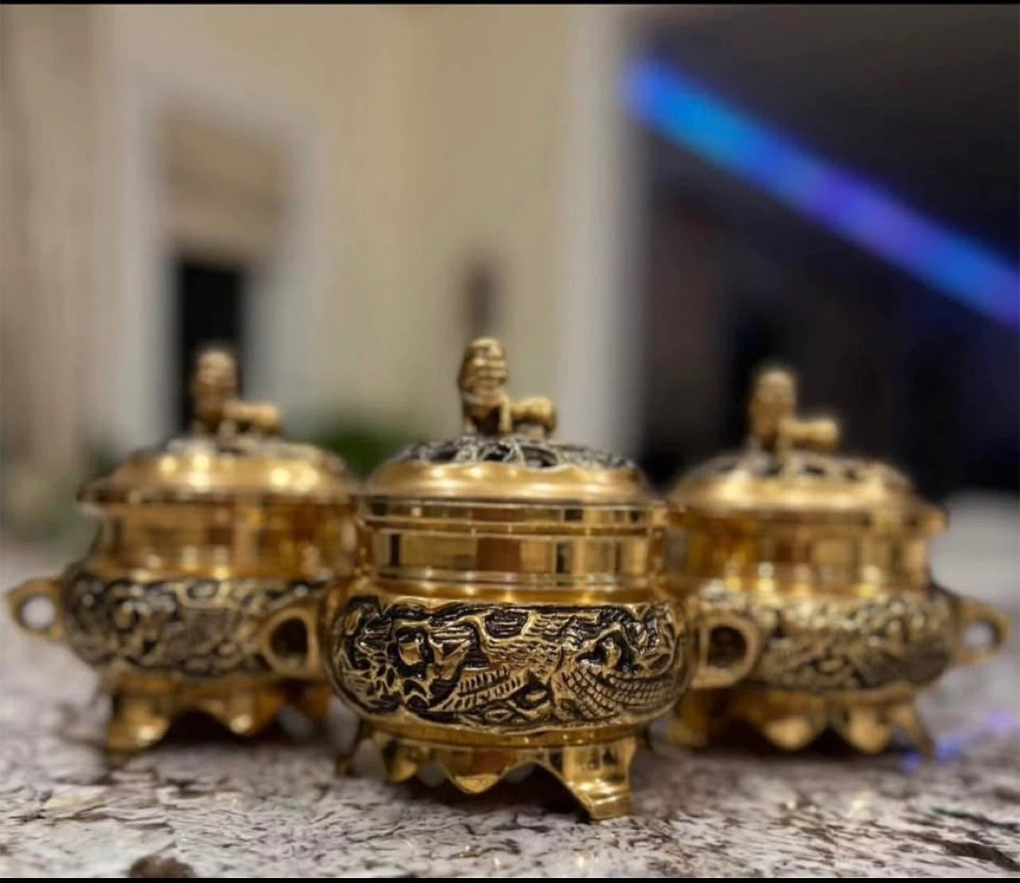 These are three decorative gold-coloured incense burners. They're crafted from metal with intricate embossed designs and lion finials. Perfect for holding incense in a living space or for decorative purposes!