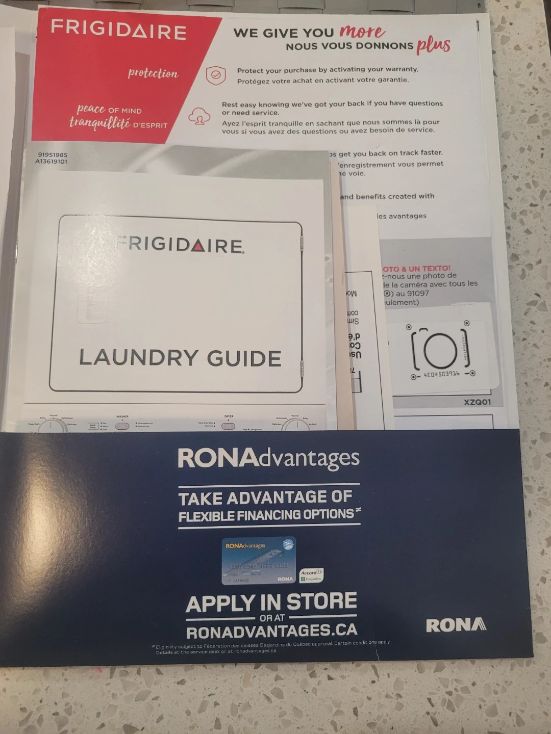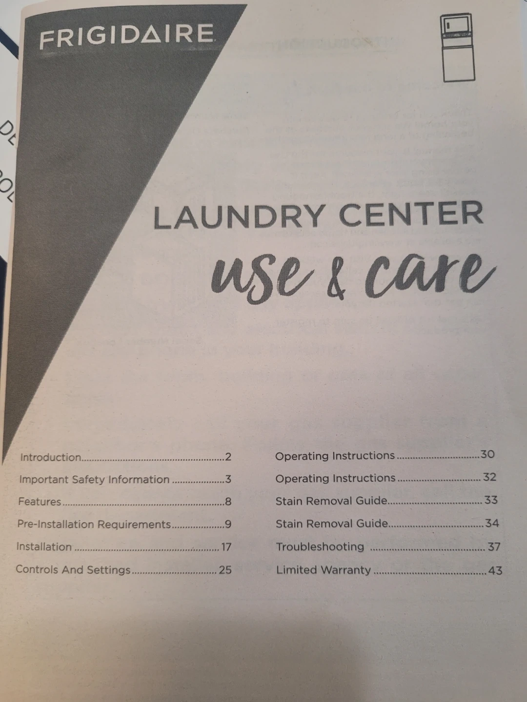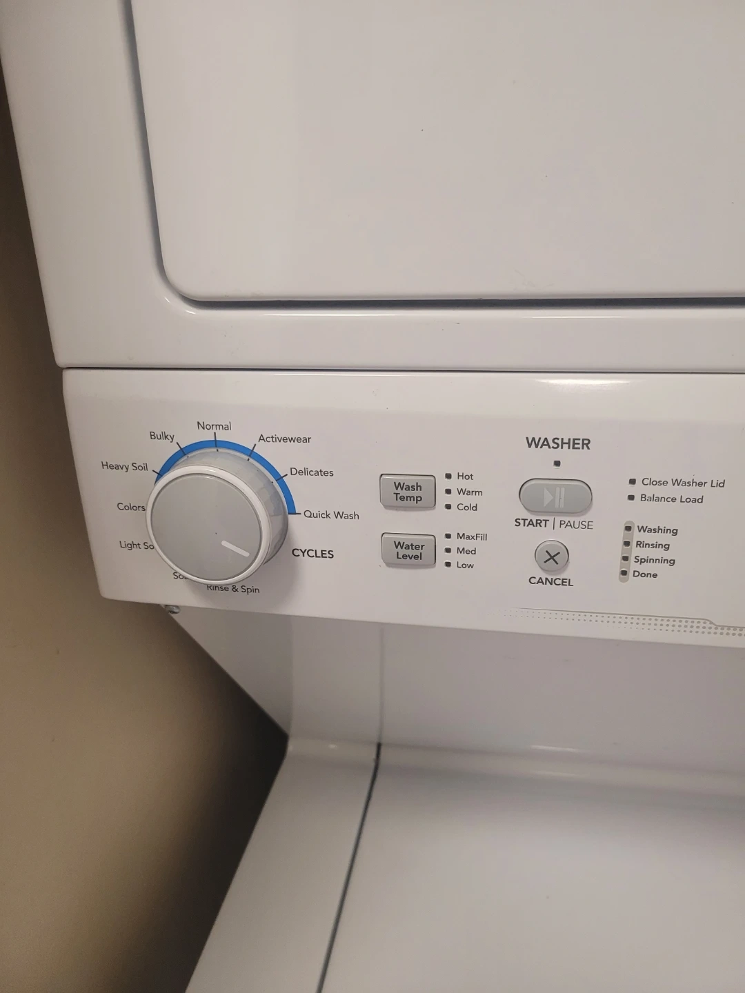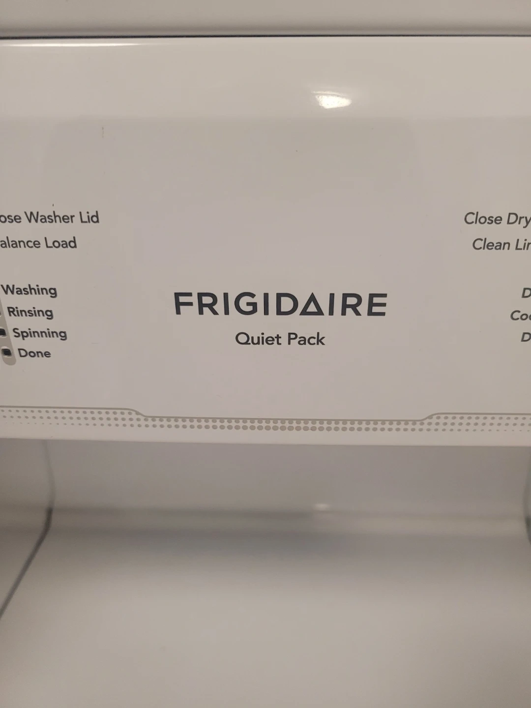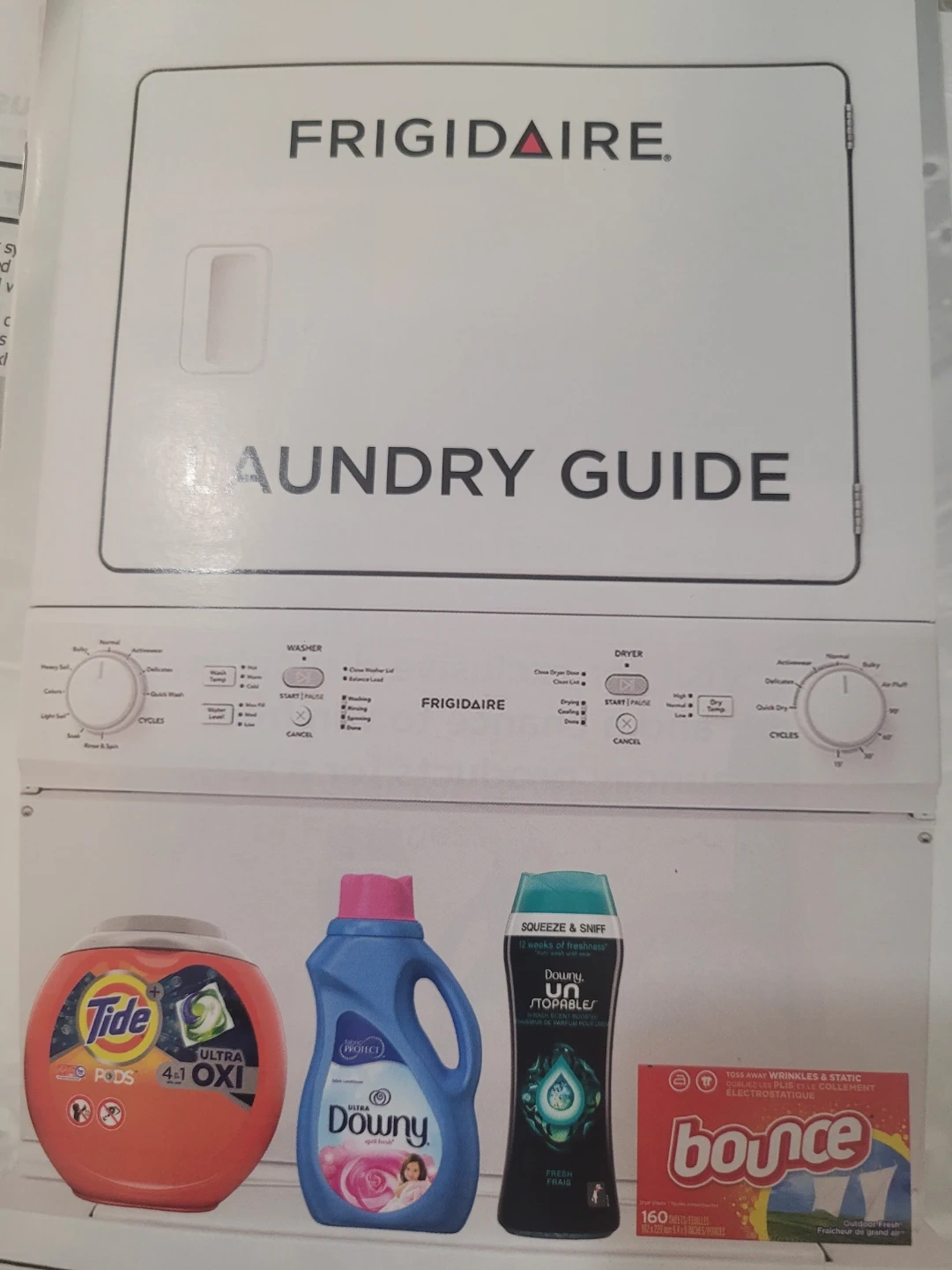 This Frigidaire stackable washer and dryer combo is in white. It offers multiple wash and dry cycles, including Normal, Delicates, Activewear, and Bulkier items. The dryer has options for different heat settings and cycle times. It's a space-saving solution for your laundry needs!Selling because we need front loading. PAID $1500+.PLEASE SEE ALL PICTURES for details