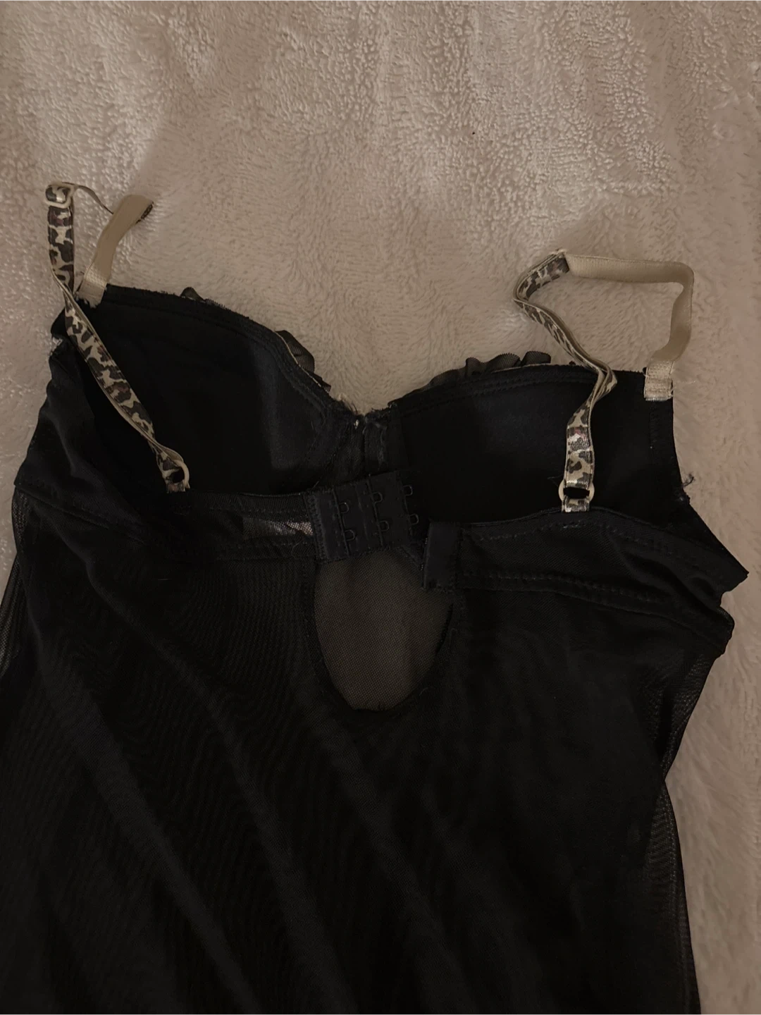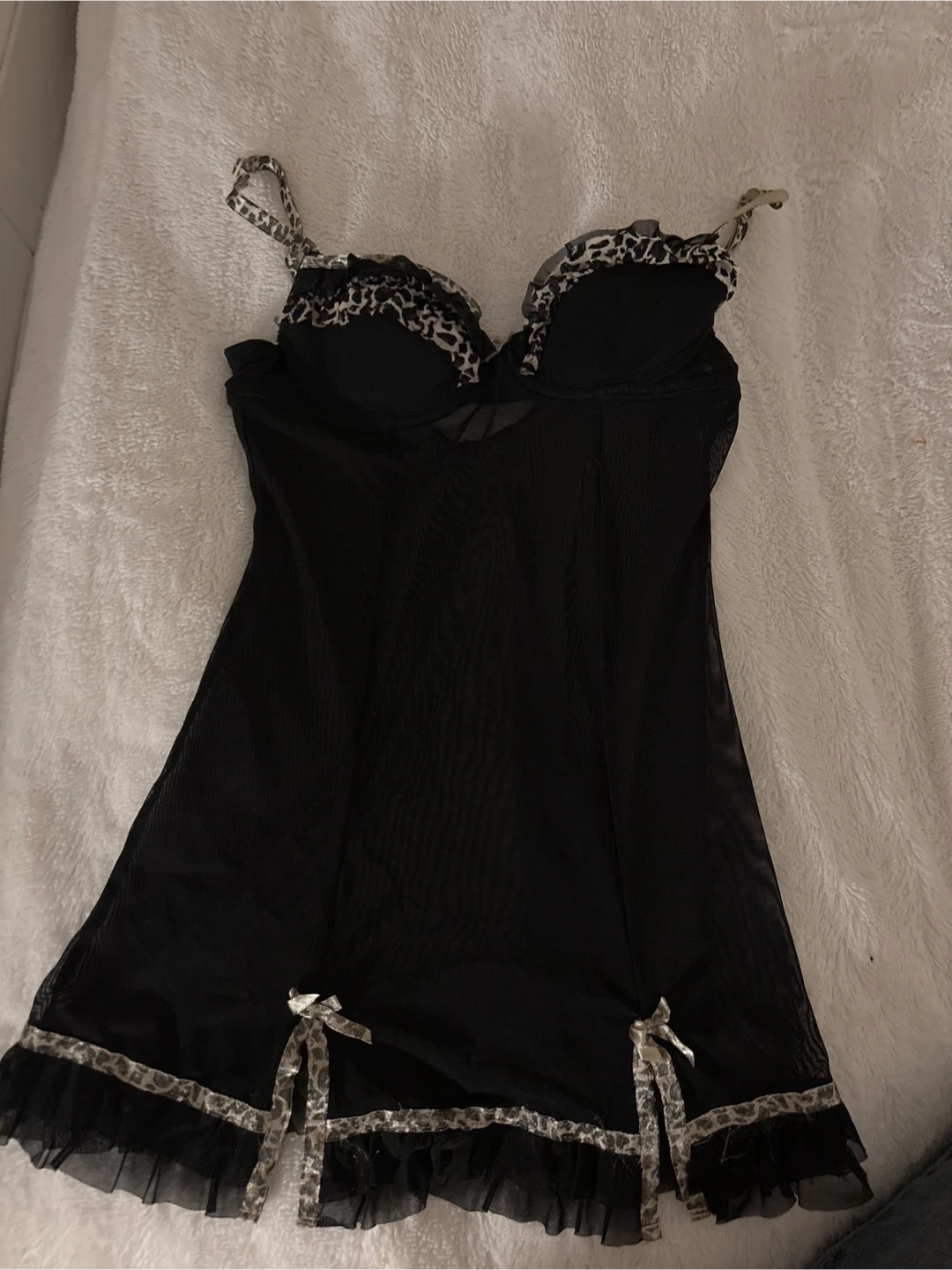 Black babydoll lingerie with leopard print trim along the cups and hem adjustable straps and a hook-and-eye closure at the back. Sheer mesh fabric. Size small