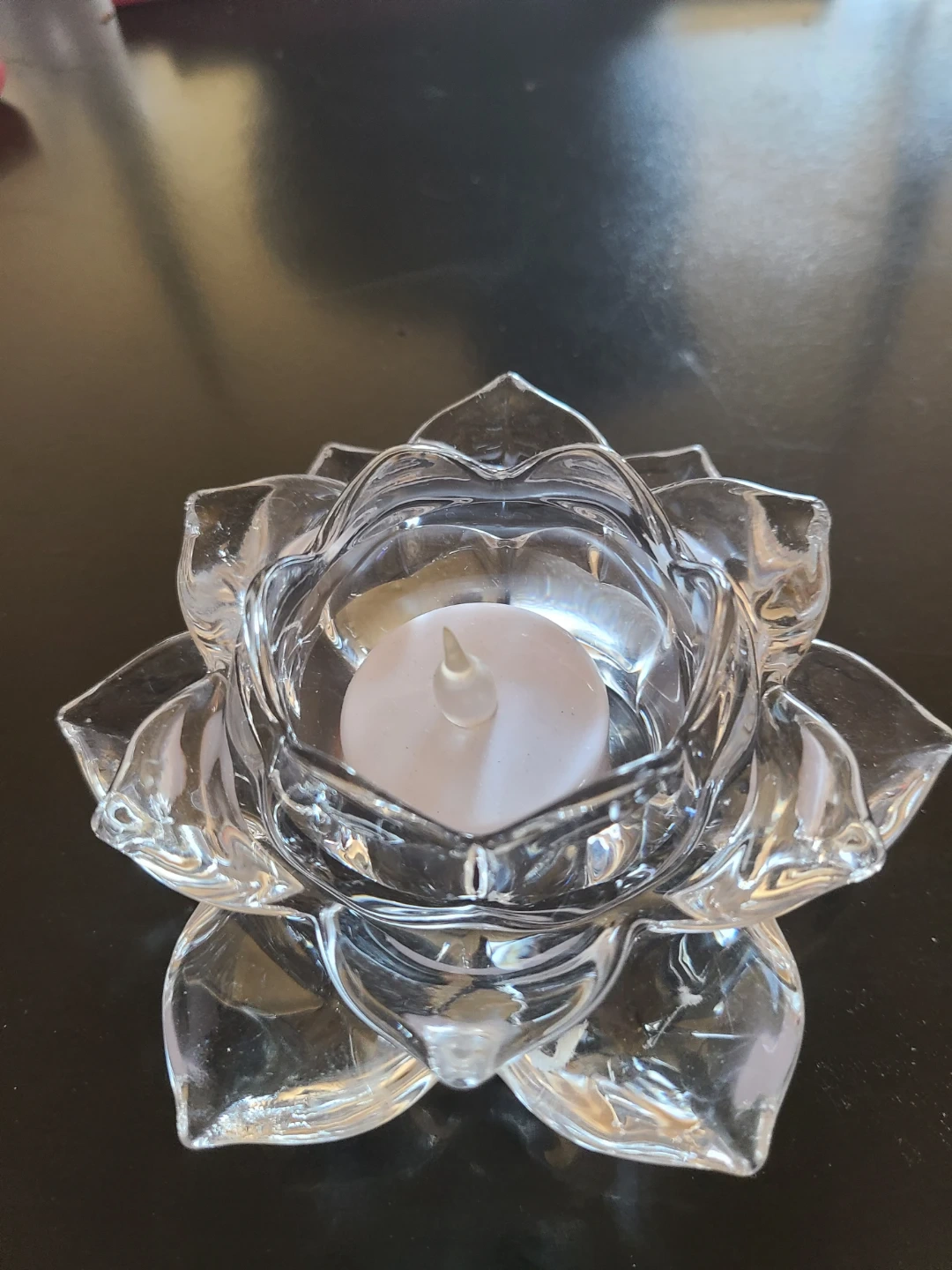 This is a clear glass candle holder designed in the shape of a lotus flower. It comes with a battery-operated LED tealight candle. Made of glass.