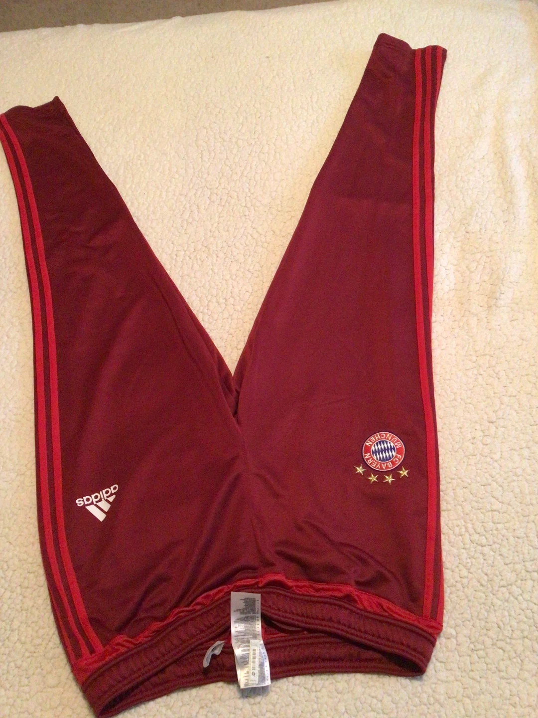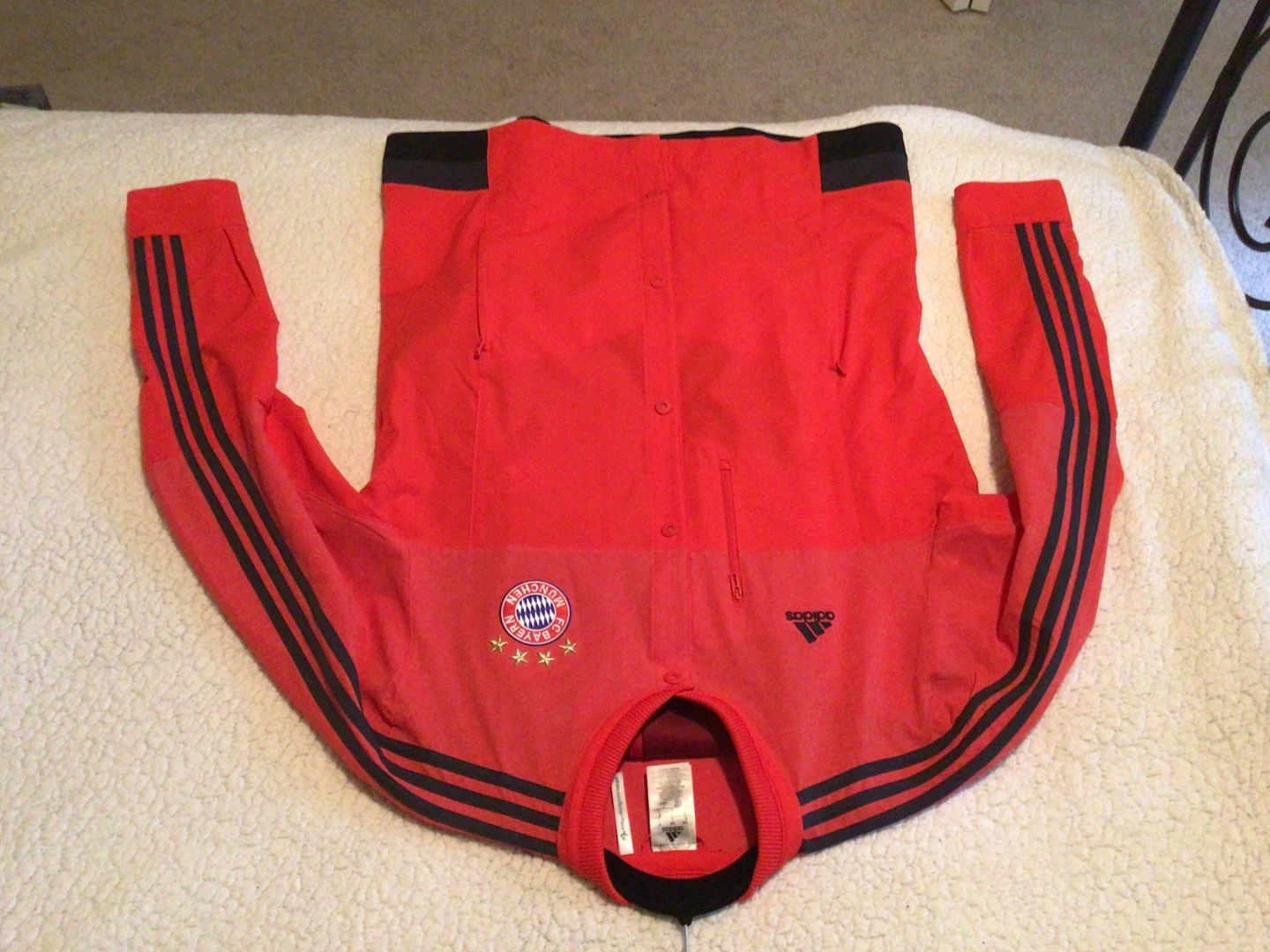 Brand new, never worn. Great Adidas FC Bayern Munich track pants and jacket . Size L. Climacool material. Jacket has zippered pockets. Great item for Adidas soccer enthusiasts and fans. Very comfortable for your training routine as well. Got it as a gift and kept in a closet for some time.