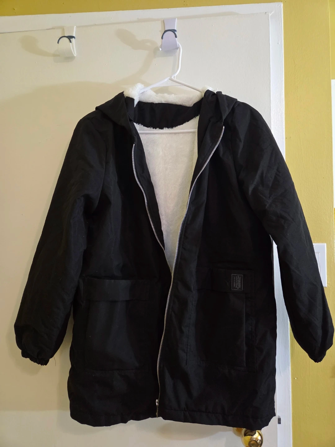 This black hooded jacket is lined with a soft, fuzzy material for extra warmth. It features a zipper closure and two front pockets. It's perfect for chilly days!