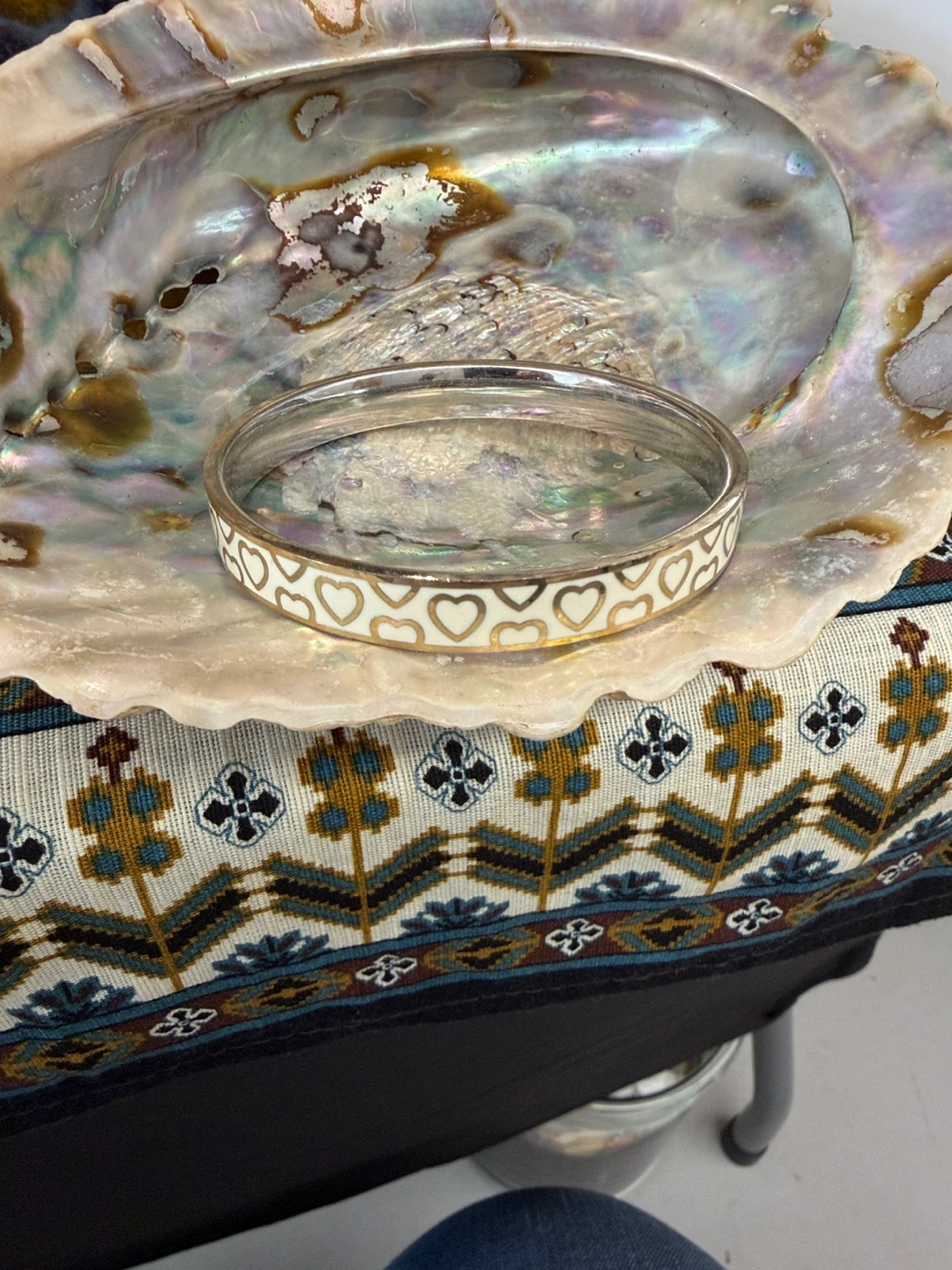 This is a simple bangle bracelet with a white enamel finish and a pattern of silver hearts. It's a classic accessory that adds a touch of charm. The bracelet has a smooth, polished finish.