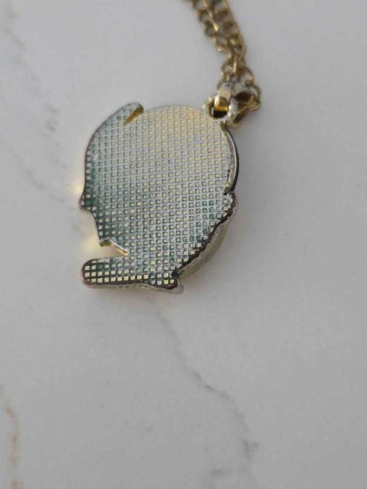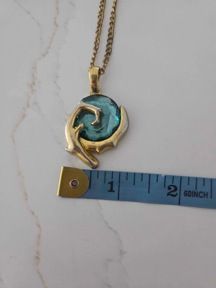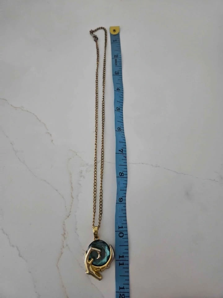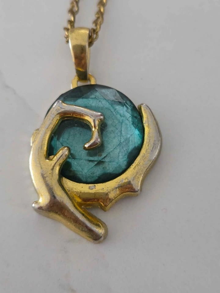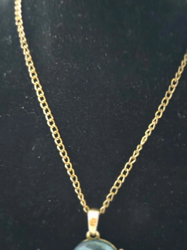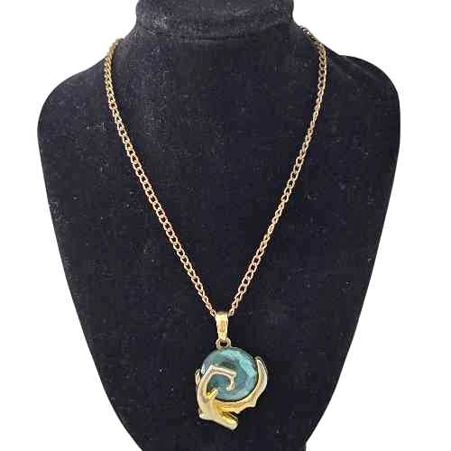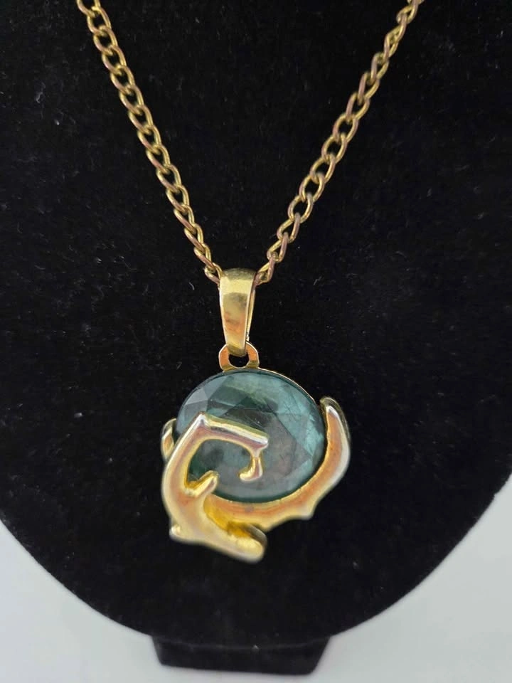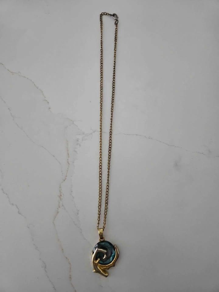 Legend of Zelda-inspired vintage-style necklace with a gold-tone chain and greenish blue orb pendant in a fantasy setting. Great for gamers, collectors, cosplay, or retro video game fans. Eye-catching and unique — a fun conversation piece that stands out from typical jewelry. Pre-owned. Good vintage condition (see pics for light wear). Unbranded, inspired design. Pick up in Oshawa near Ritson and Hillcroft