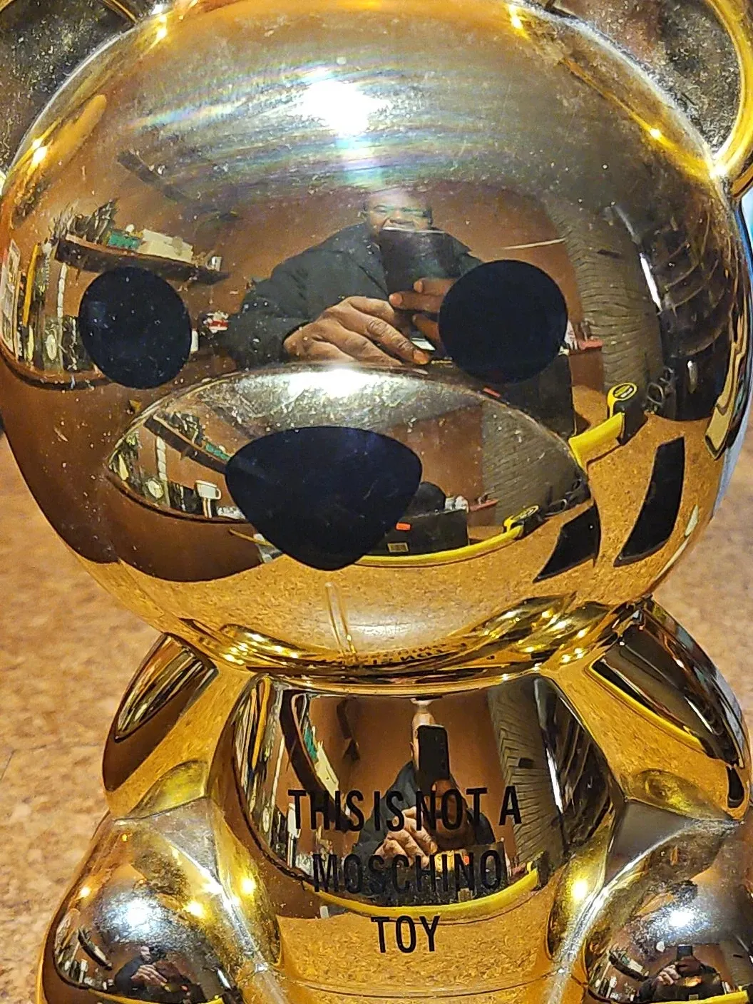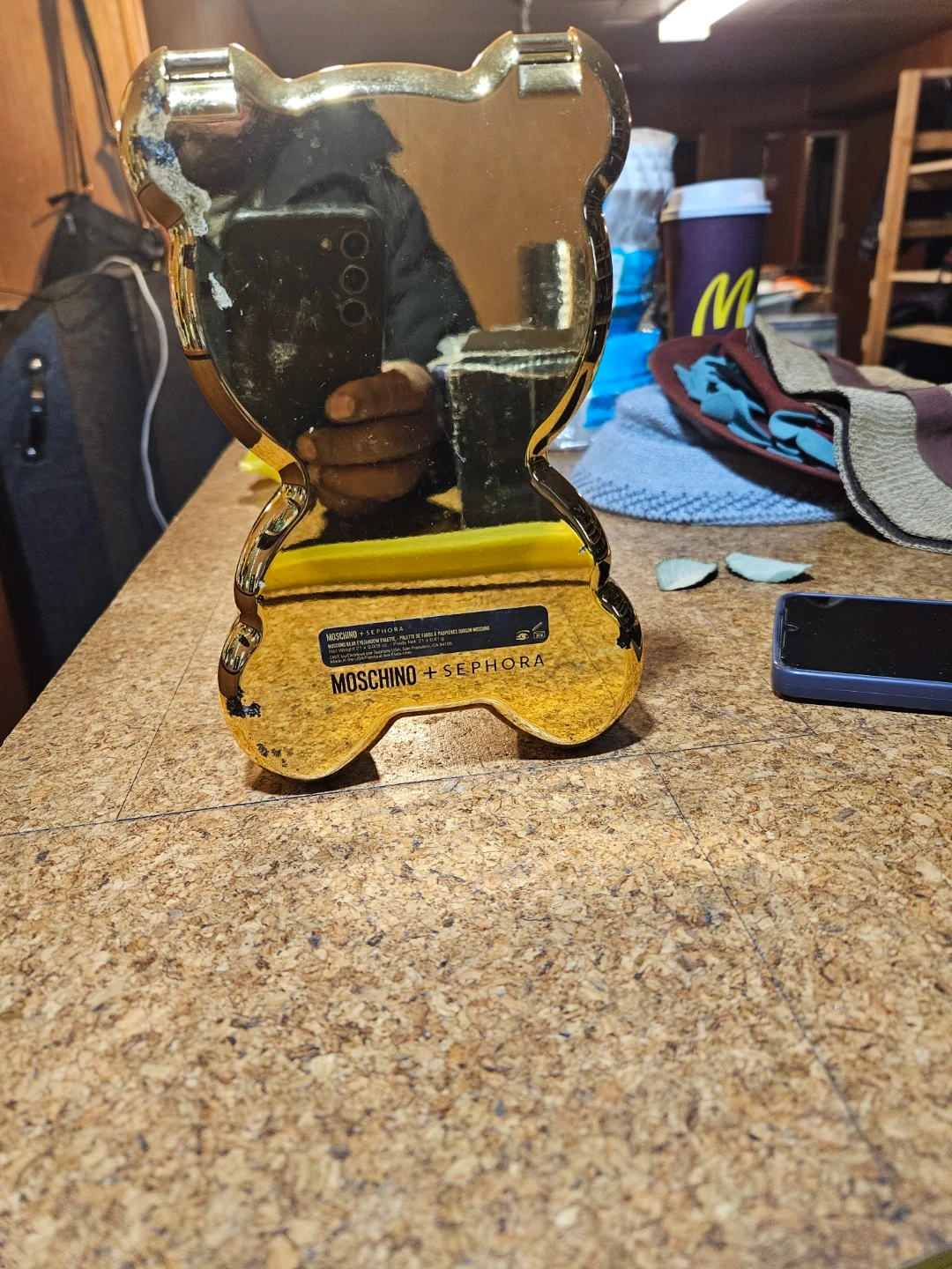 This is the Moschino + Sephora eyeshadow palette shaped like a bear. It's a gold-toned compact with multiple eyeshadow shades. The compact includes a mirror inside.