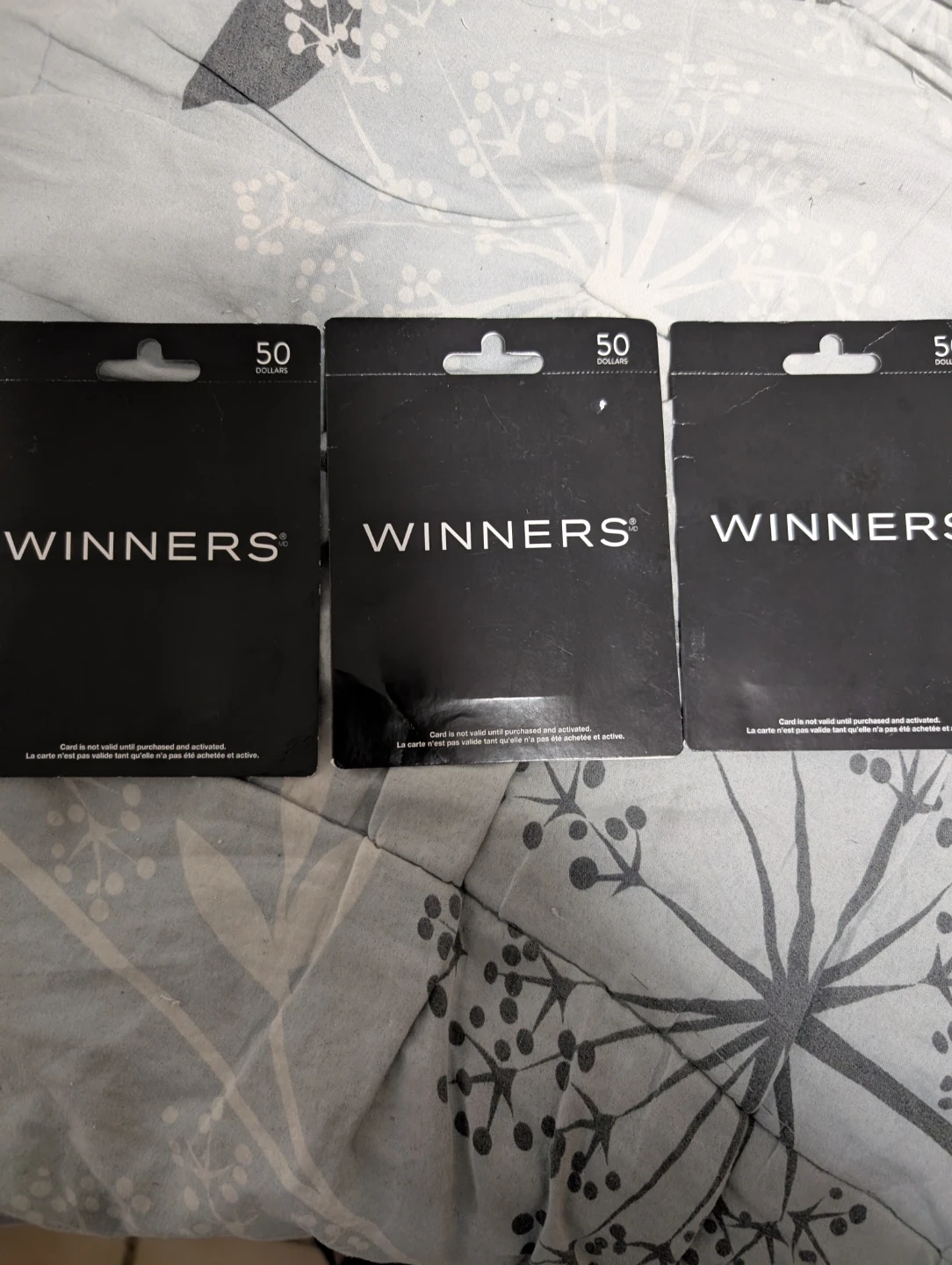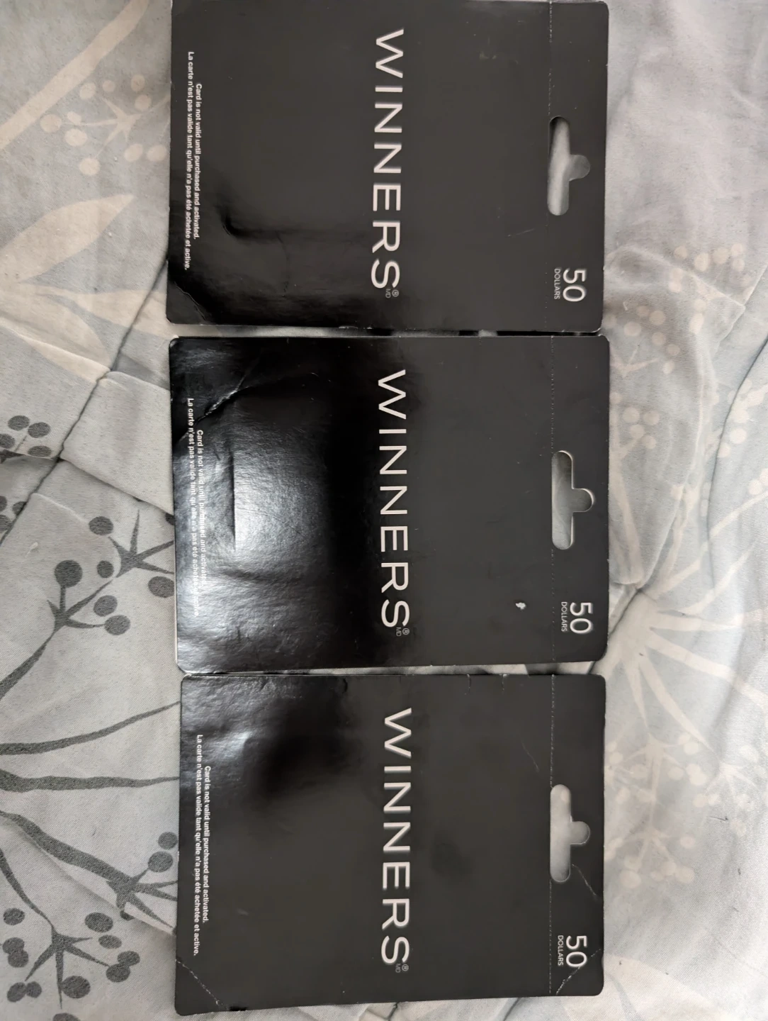 Three Winners gift cards, each with a $50 value. These cards are perfect for last-minute gifts or if you're not sure what to get someone. They can be used for apparel, home decor, and more at Winners stores. Got it for my birthday. Don't need it.