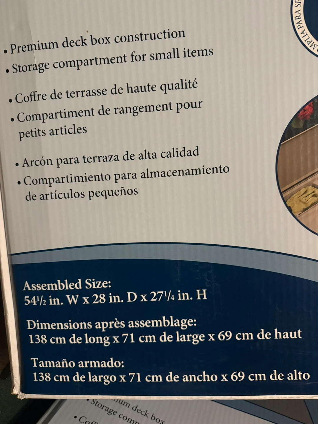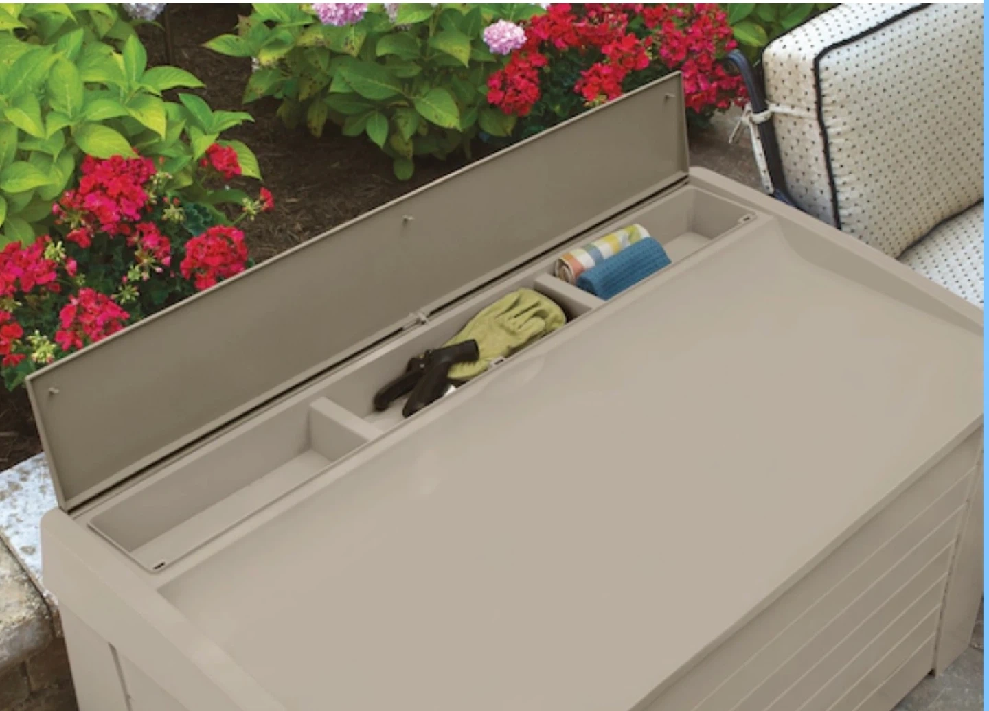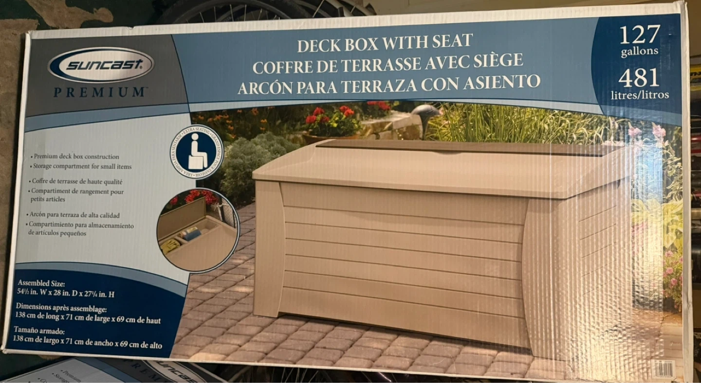 Suncast Premium deck box with seat, perfect for outdoor storage. It's 127 gallons and has a storage compartment for small items. Assembled size is 54.5 in. W x 28 in. D x 27.25 in. H. This durable resin box is great for keeping cushions and garden tools tidy!