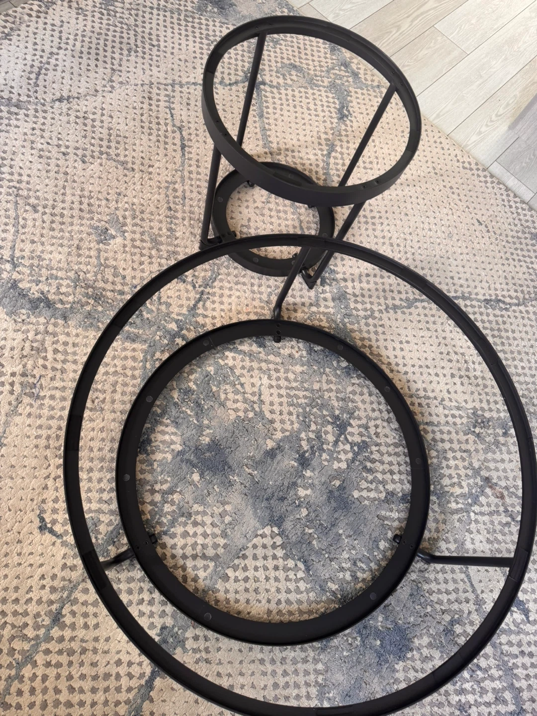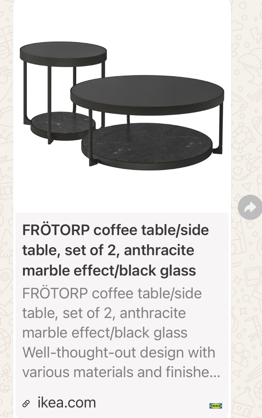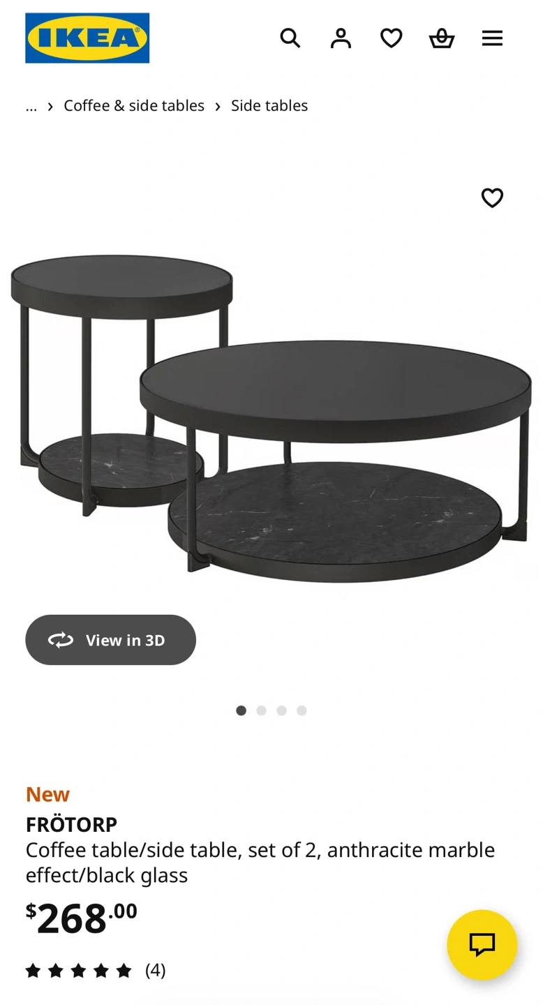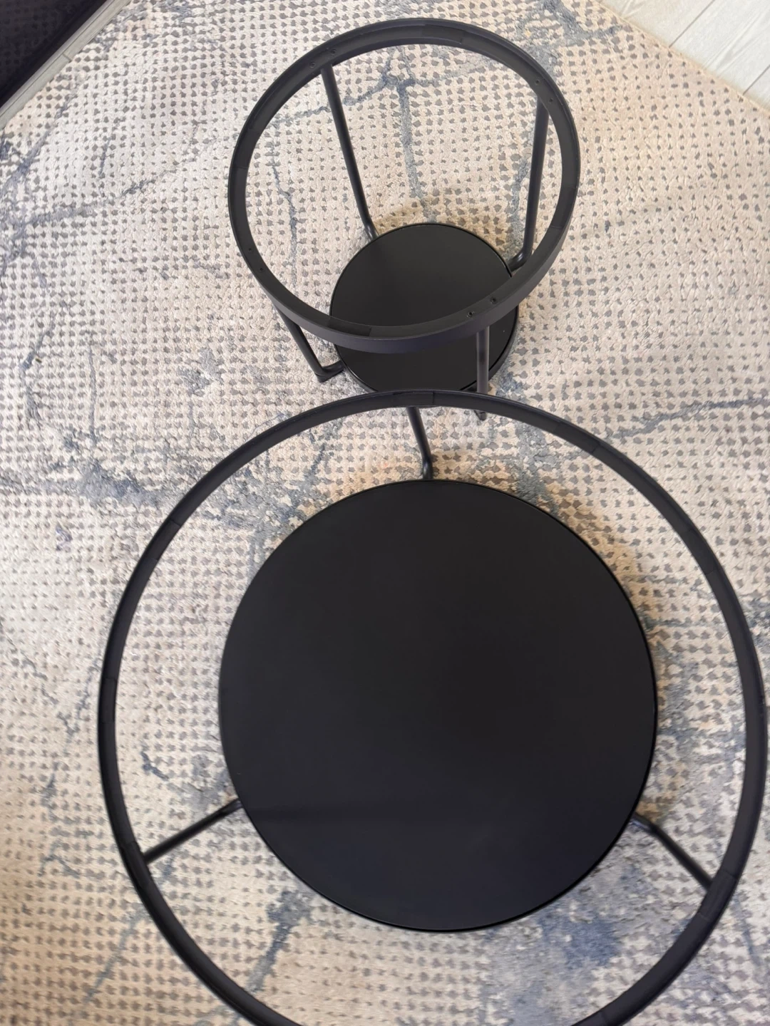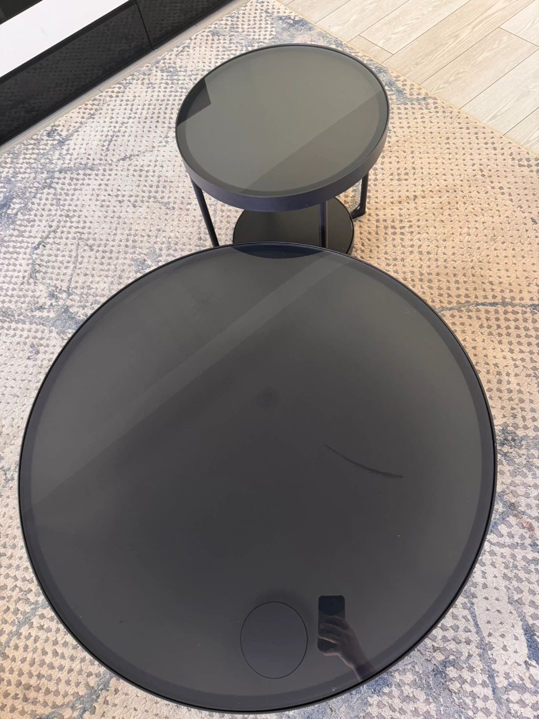Set of two FRÖTORP tables with anthracite marble effect and black glass tops. Includes one coffee table (88 cm) and one side table (48 cm). They're a well-thought-out design with various materials and finishes.
