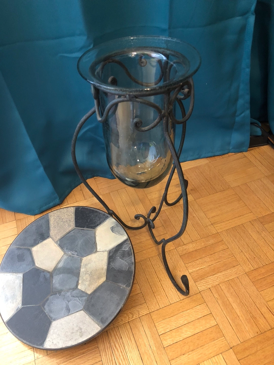 Ornate wrought iron stand. Features a round slate mosaic table top and a large glass vase. Perfect as a side table or unique decor piece.