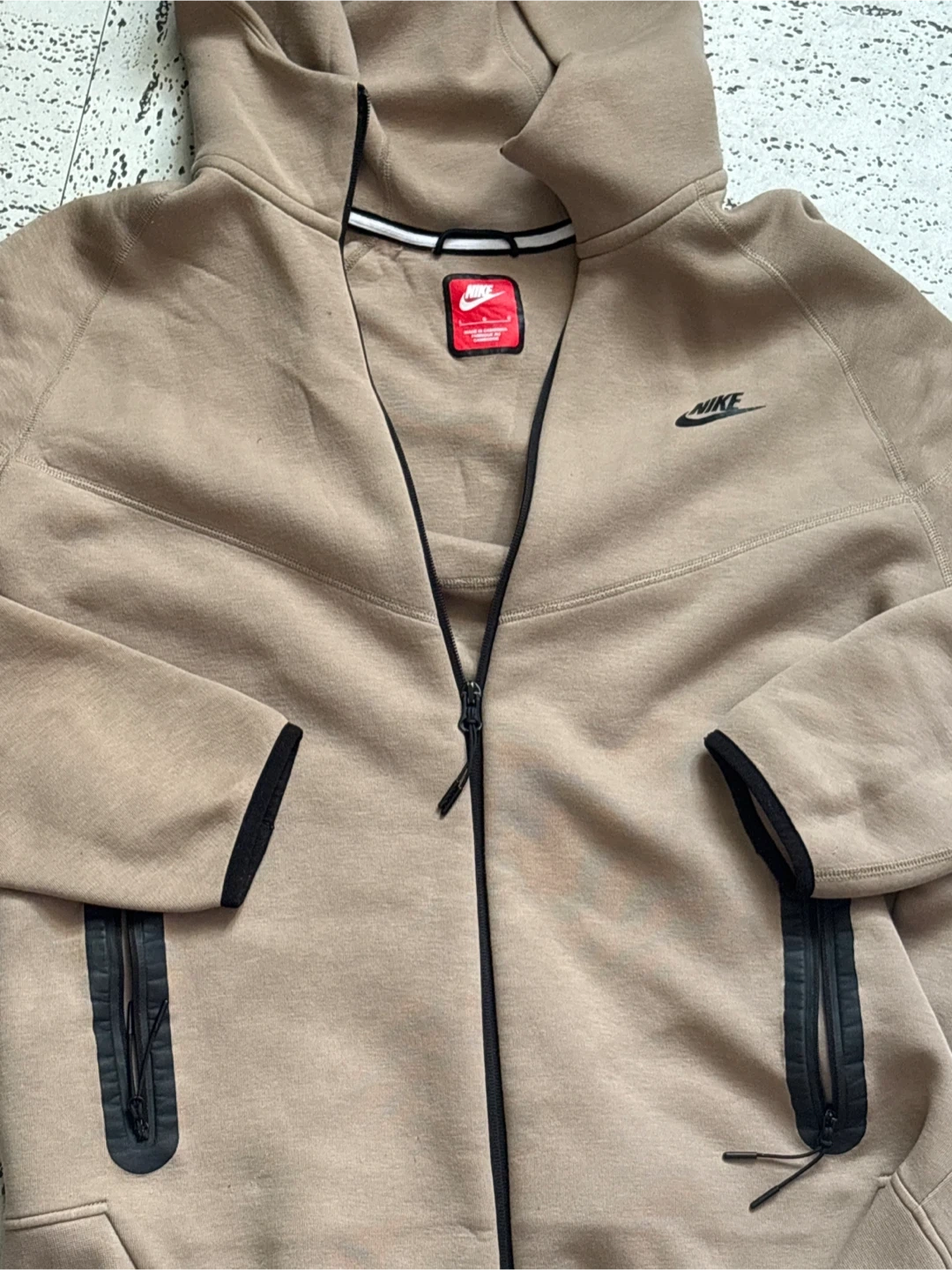 This is a Nike Tech Fleece full-zip hoodie in a tan colour. It's made from a blend of cotton and polyester. Features zippered pockets and a comfortable hood.