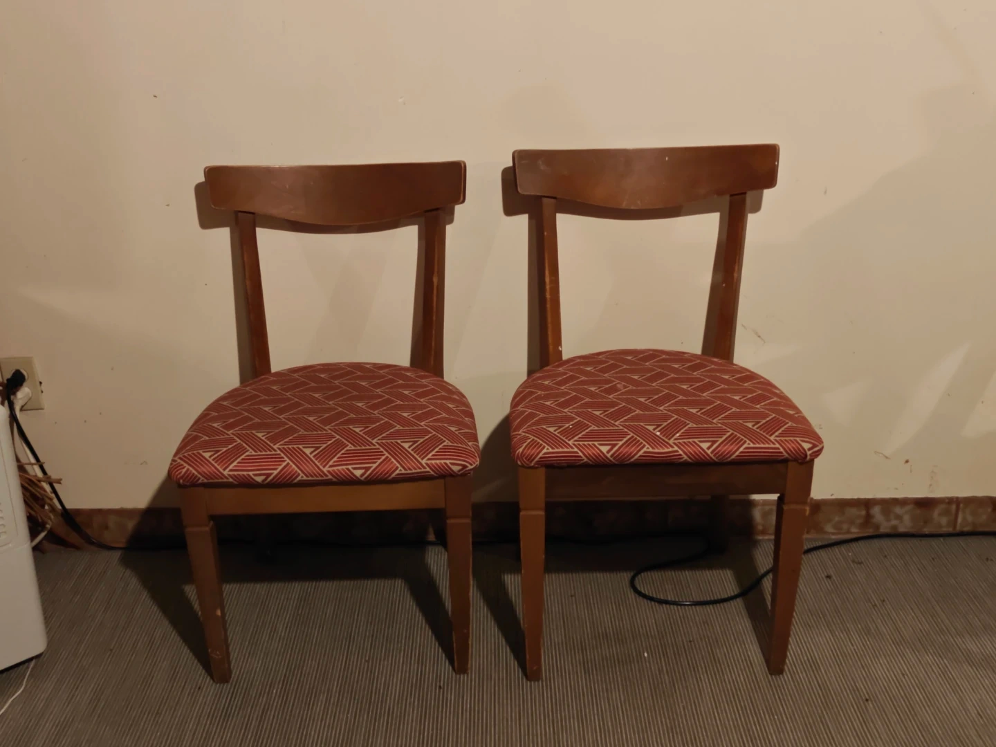 Two wooden chairs with red and white geometric patterned seats. The wood frames are a warm, medium brown. These chairs would be handy for a small dining area or extra seating when you have company!