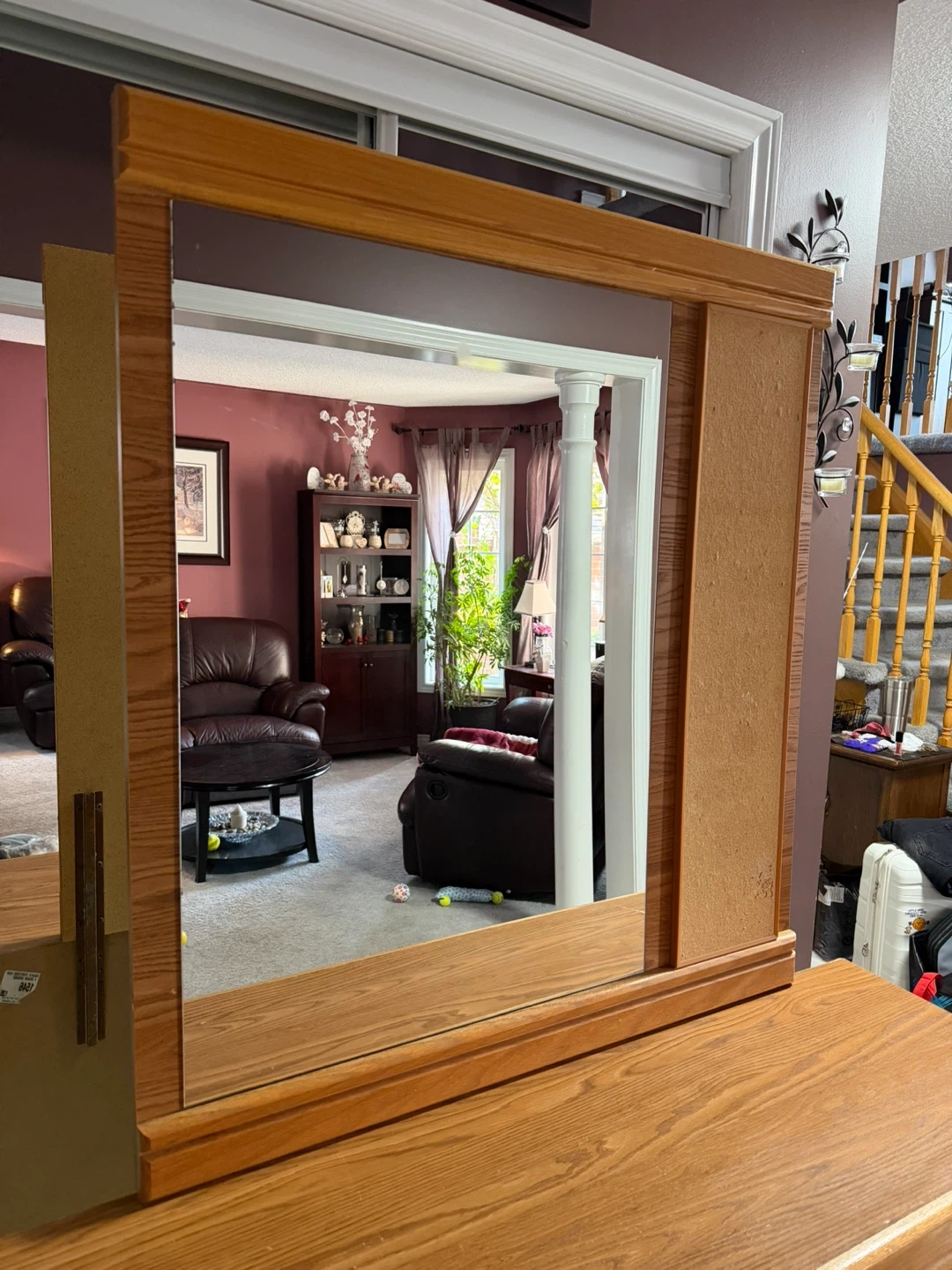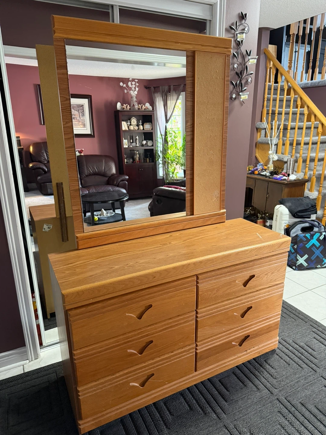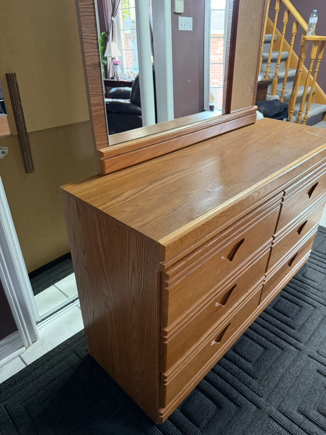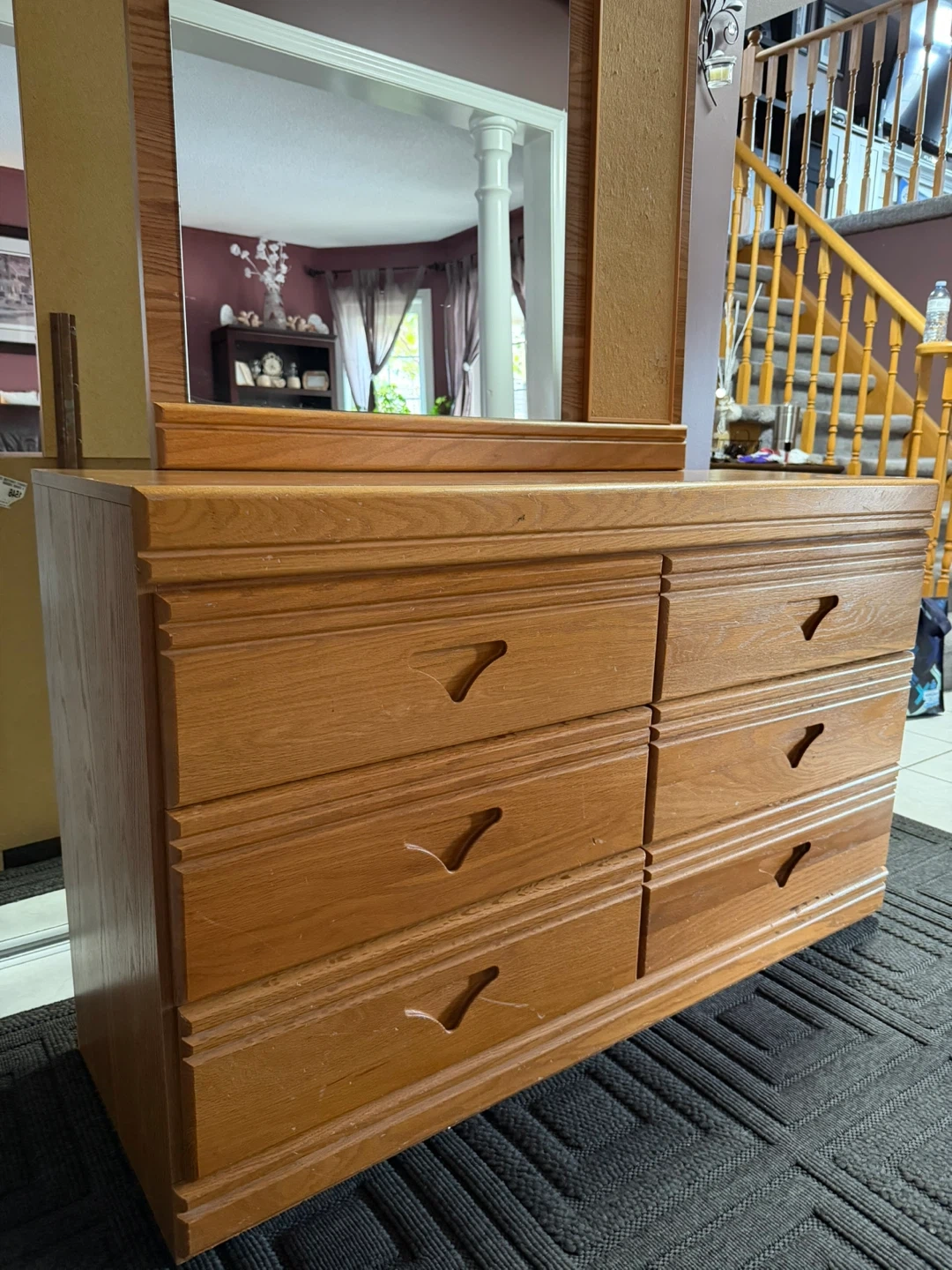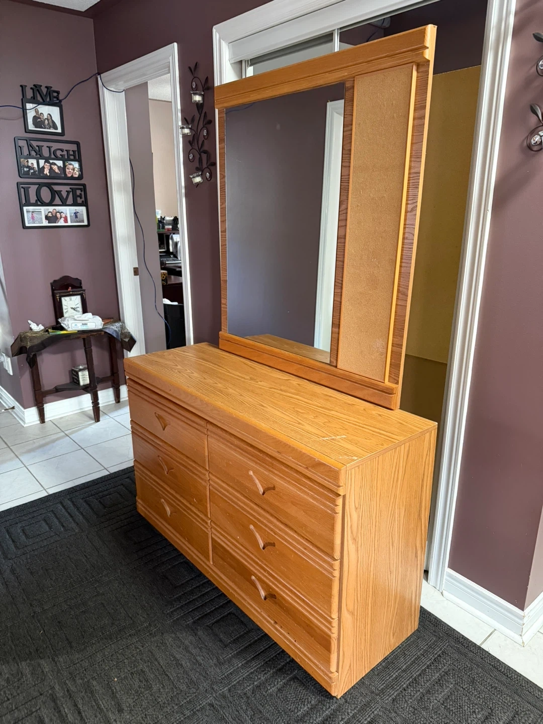 Wooden dresser with a mirror, perfect for adding some storage and style to your bedroom!