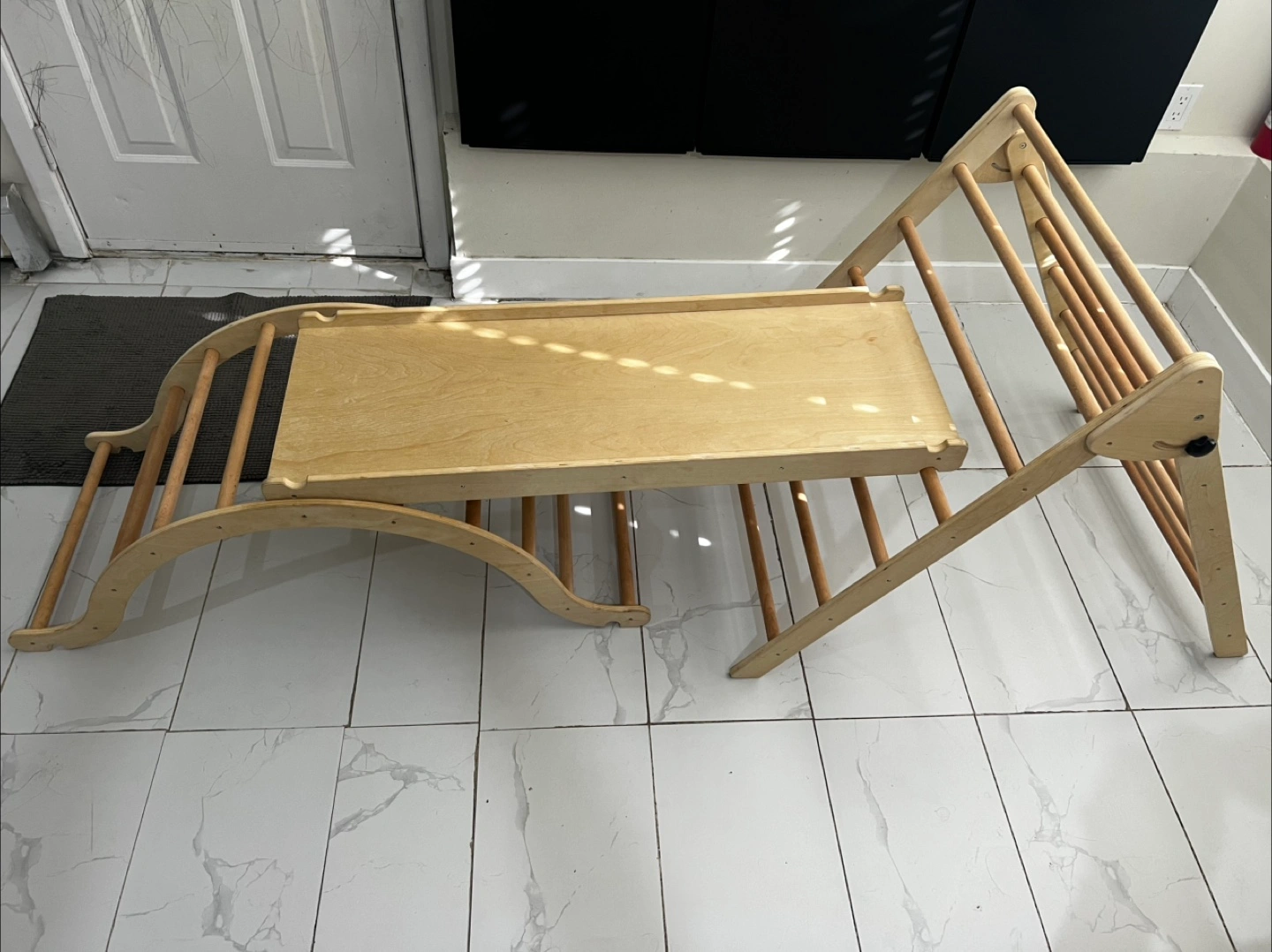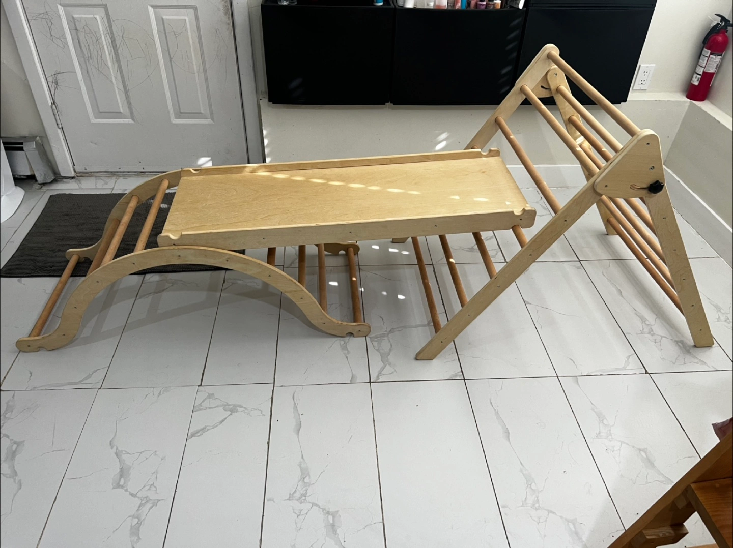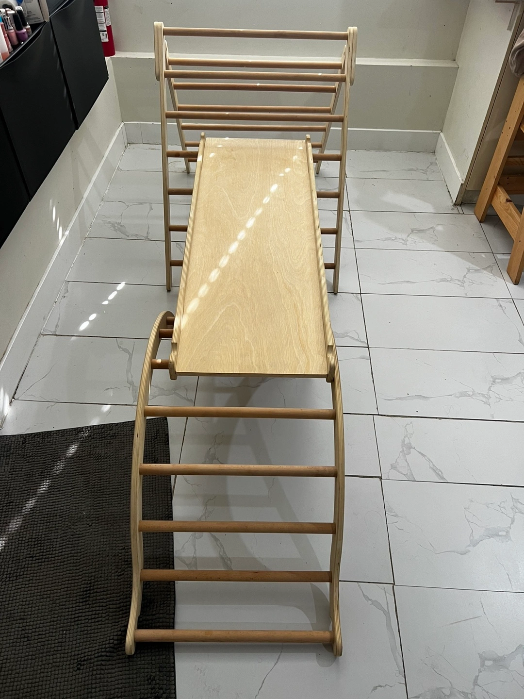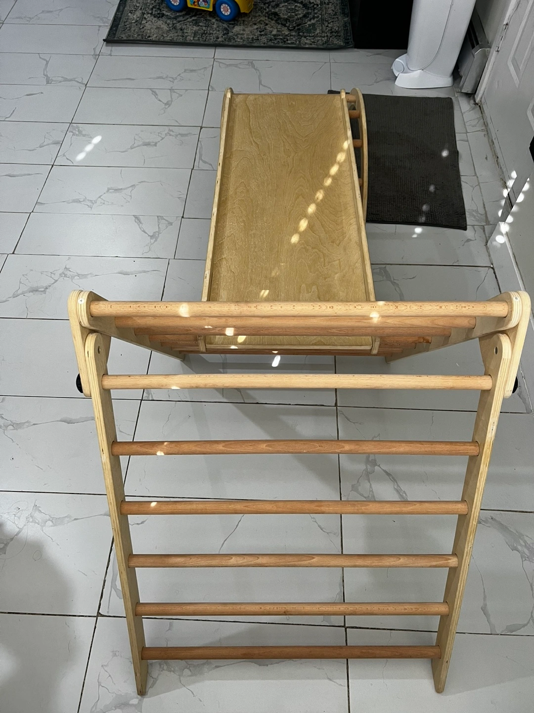 Wooden Pikler triangle climber and slide set for kids. Made from natural wood. It's a great indoor active play structure. Perfect for toddlers and young children to develop motor skills!