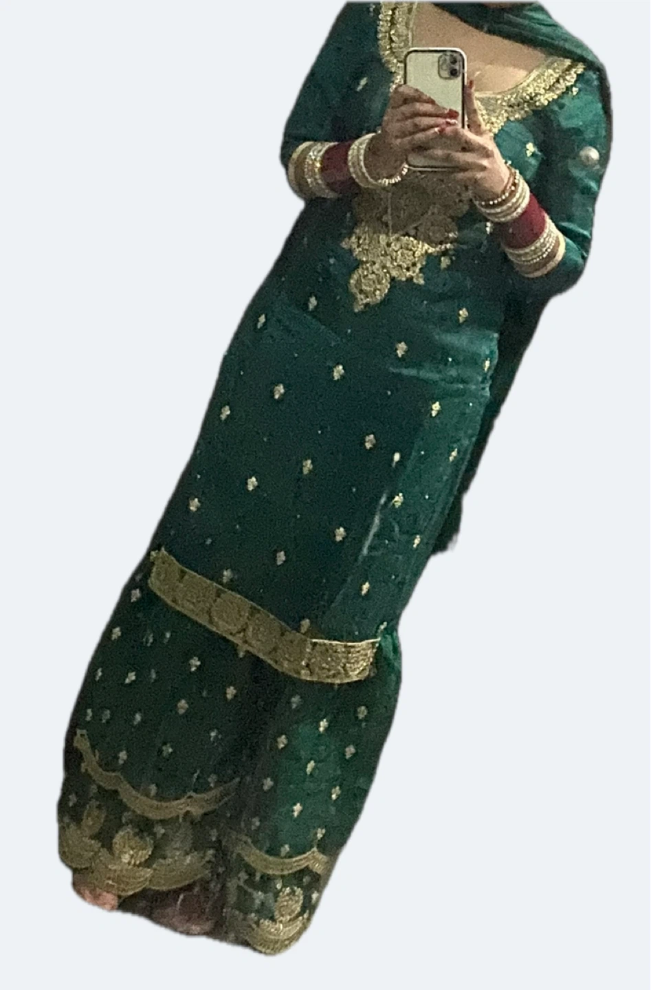 Beautiful emerald green salwar kameez set. It's detailed with intricate gold embroidery and small floral motifs throughout. The set includes a matching dupatta and is finished with decorative gold trim on the sleeves and hem. Perfect for festive occasions!