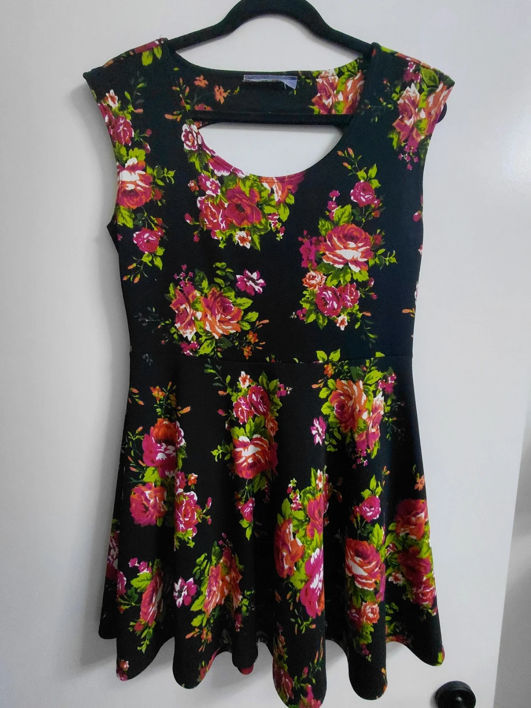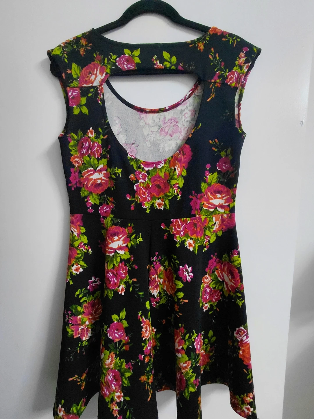 Black dress with a vibrant floral print. It features a cutout detail at the back and cap sleeves. Dress material is soft and stretchy. Size Large