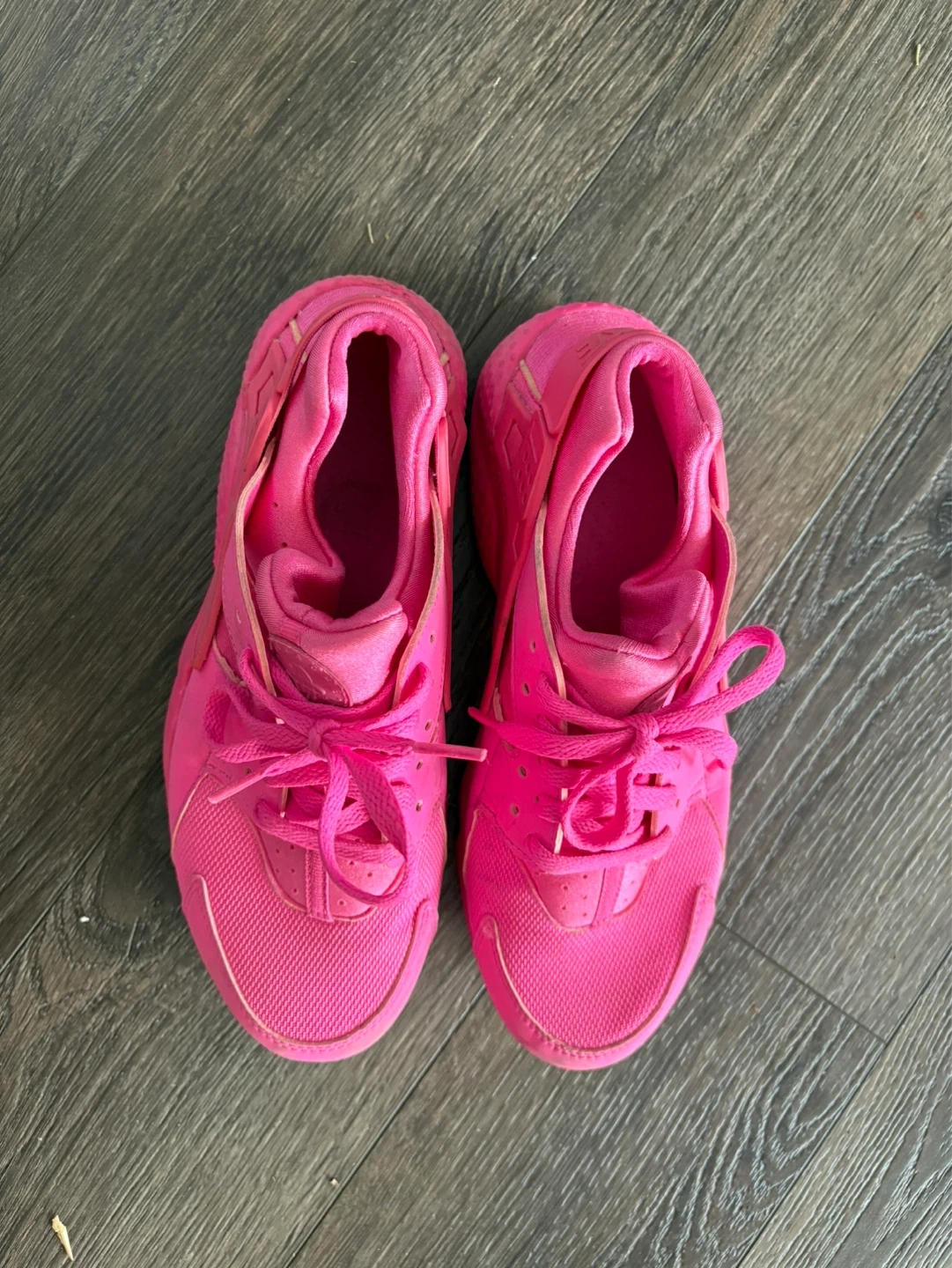 These bright pink Nike Air Huarache shoes are a vibrant addition to any sneaker collection. They're made with a comfortable, breathable mesh and rubber sole. Perfect for everyday wear