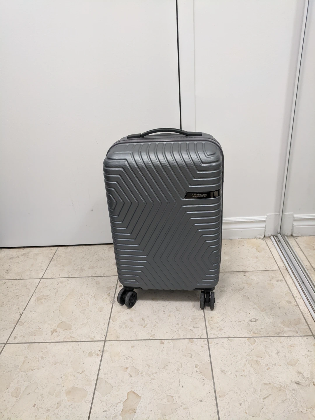 This is an American Tourister hardside spinner suitcase. It's a grey colour and has four wheels for easy manoeuvring. The interior features zippered compartments for organized packing.13.3"x9.5"x20.5" . Pick up at 195 Merton Street Toronto or pick up at Subway station Davisivill. And I can deliver it to your house but you need to pay me another $3. Thanks.
