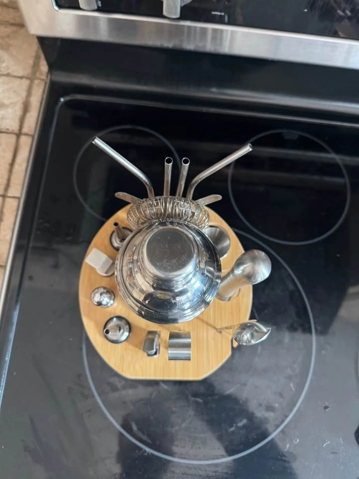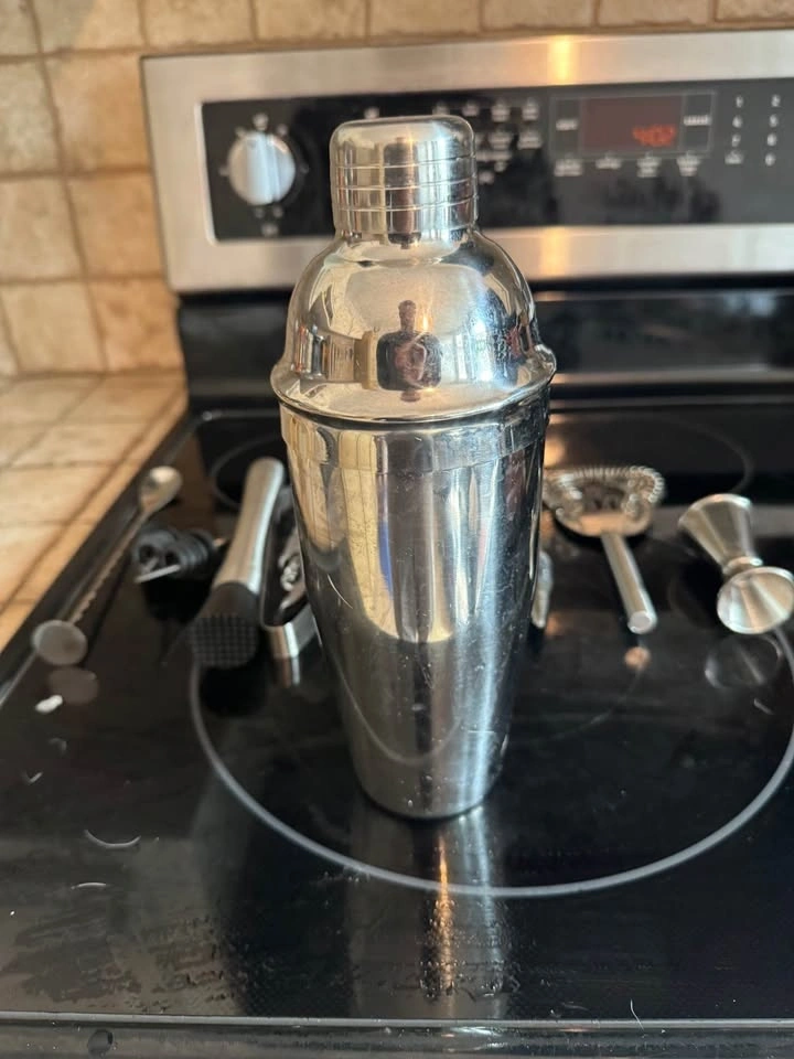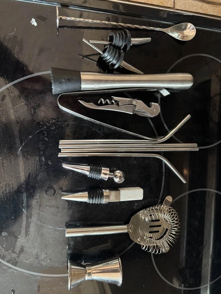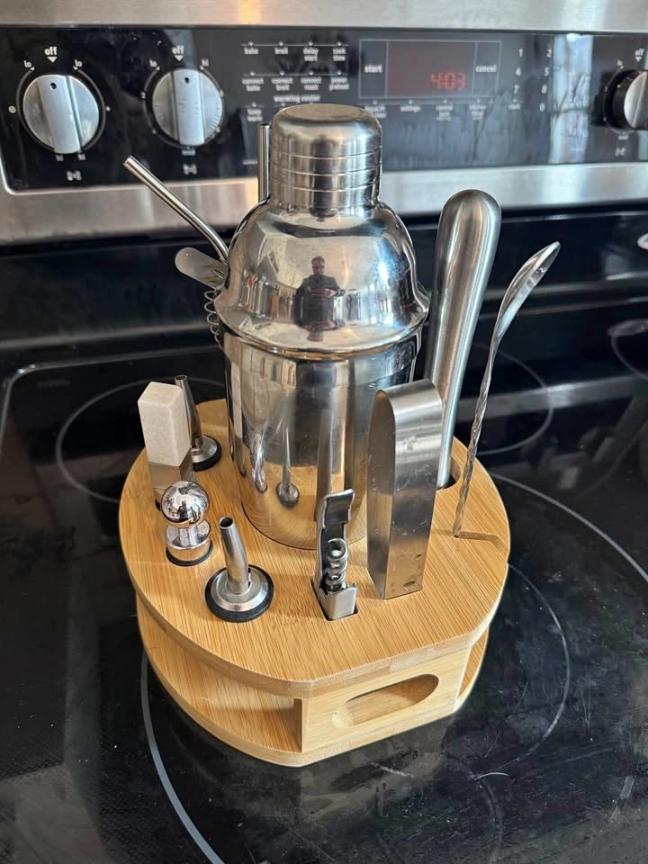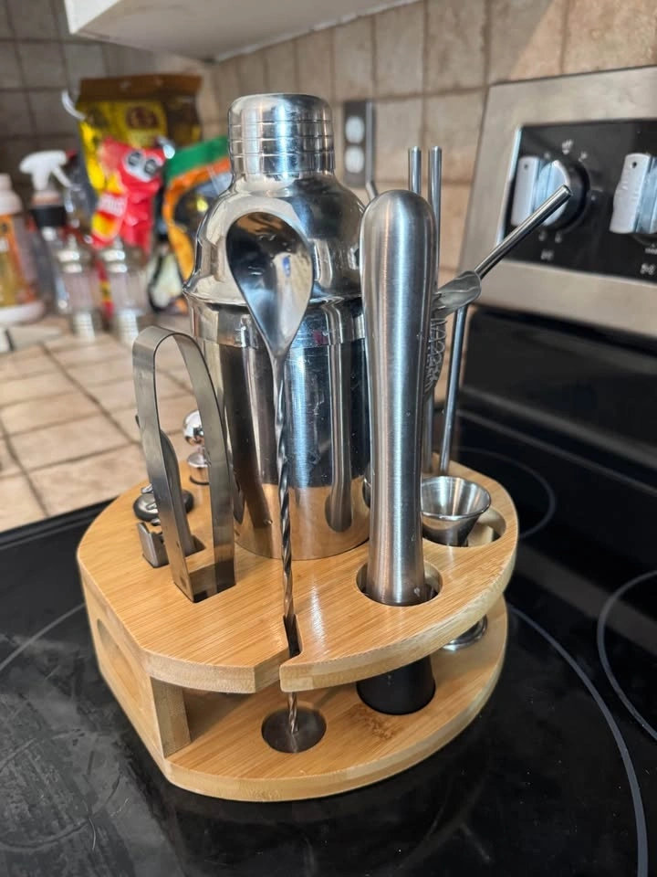 Sleek cocktail shaker set with all the tools you need for making drinks. Has stainless steel shaker, jigger, muddler, bar spoon, strainers, pourers, ice tongs, and a corkscrew. Comes with a nice bamboo stand to keep everything organized.