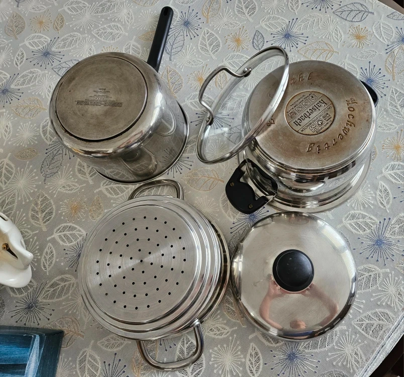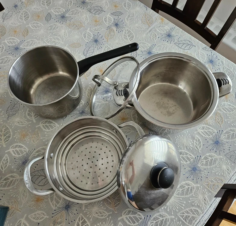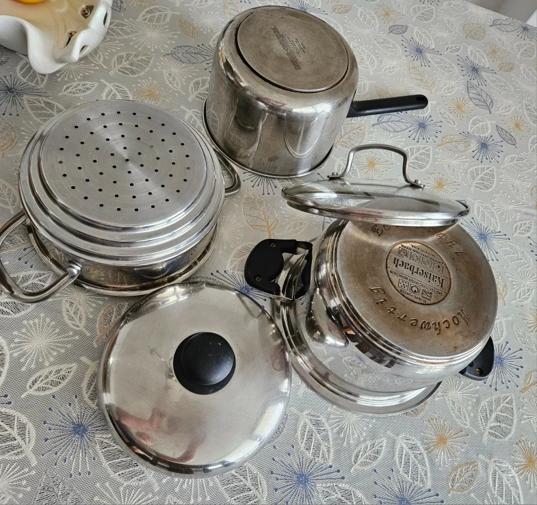 46Selling a Kaiserbach Kochwertig cookware set! It includes a pot with a lid, a saucepan, and a steamer insert. All pieces are stainless steel and in good condition.