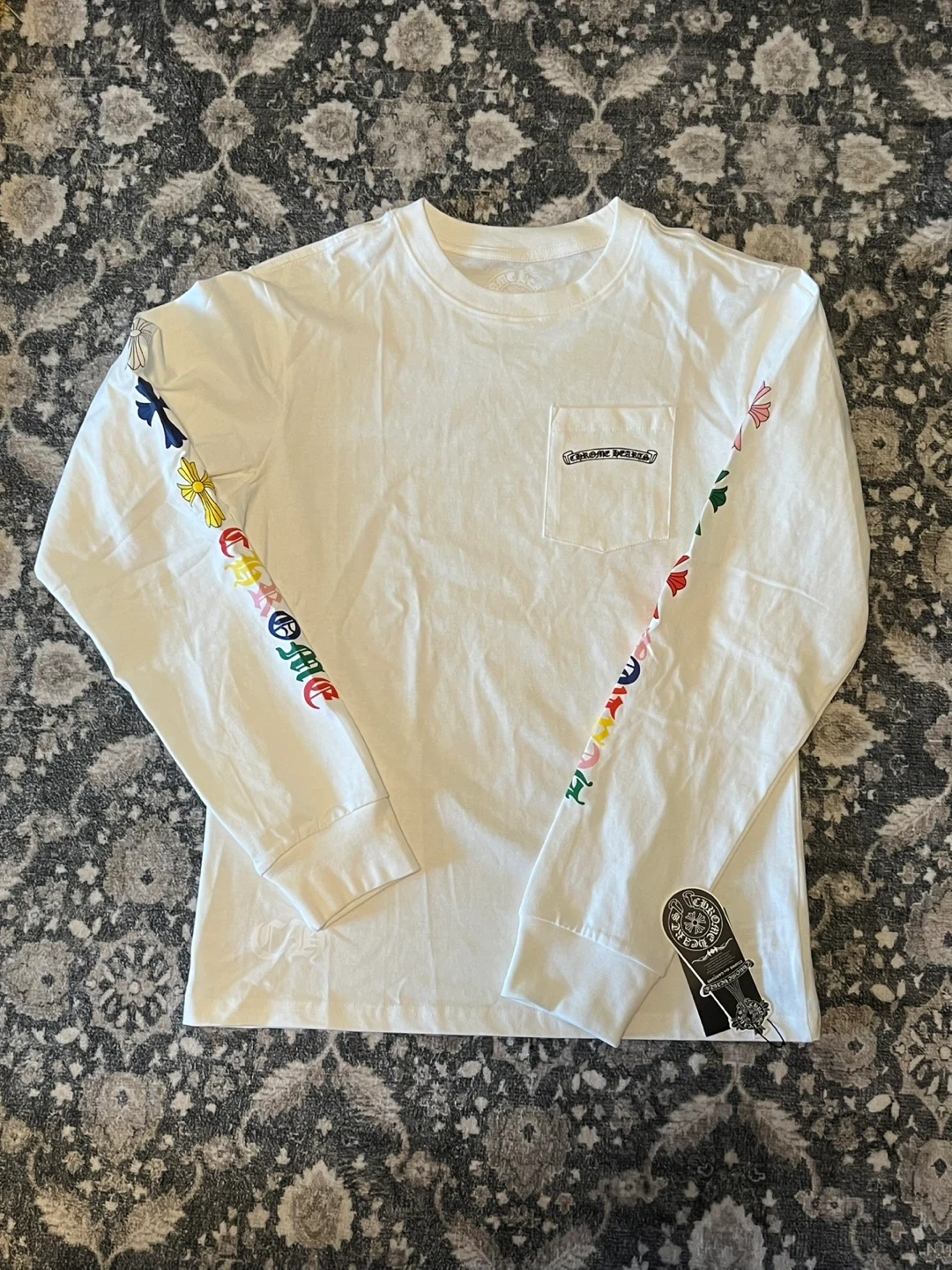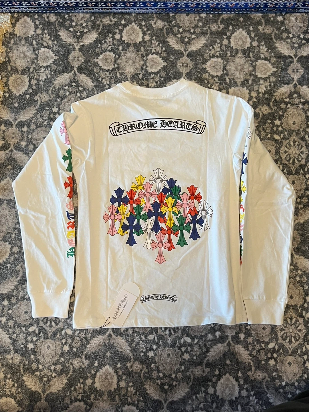 White long sleeve t-shirt from Chrome Hearts. Features multicolor crosses on the sleeves and back graphic. Cotton material.