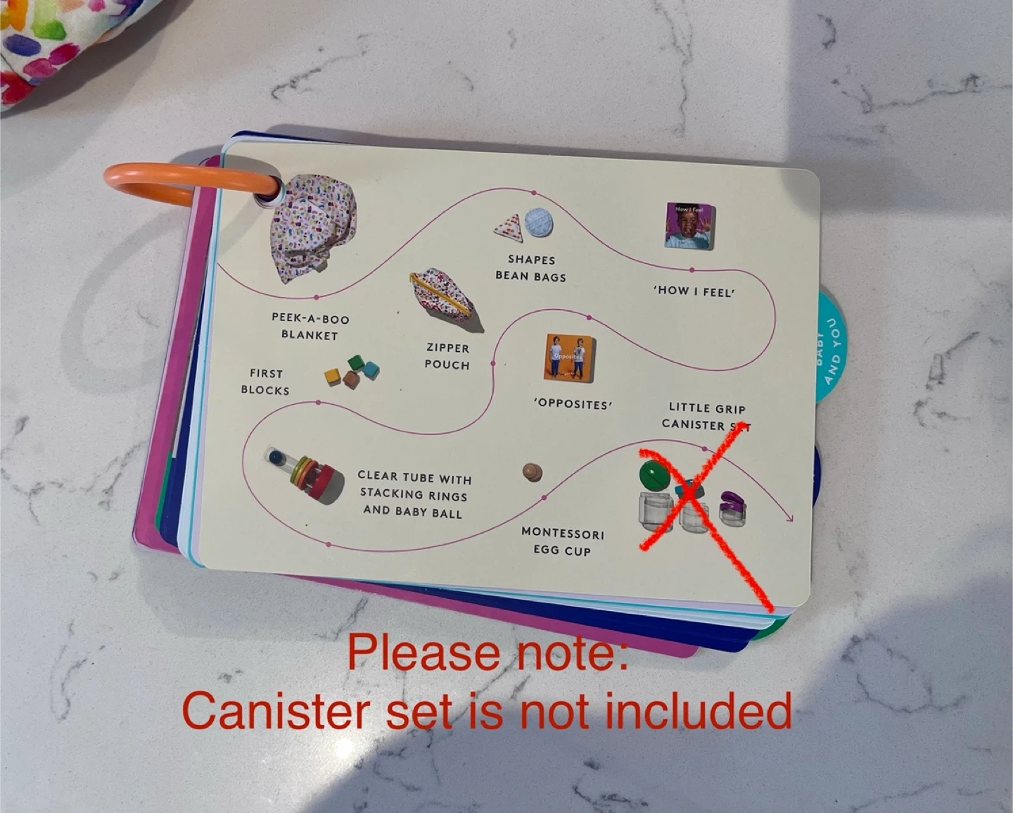 - Clear tube with stacking rings and baby ball (plastic ball that rattles)