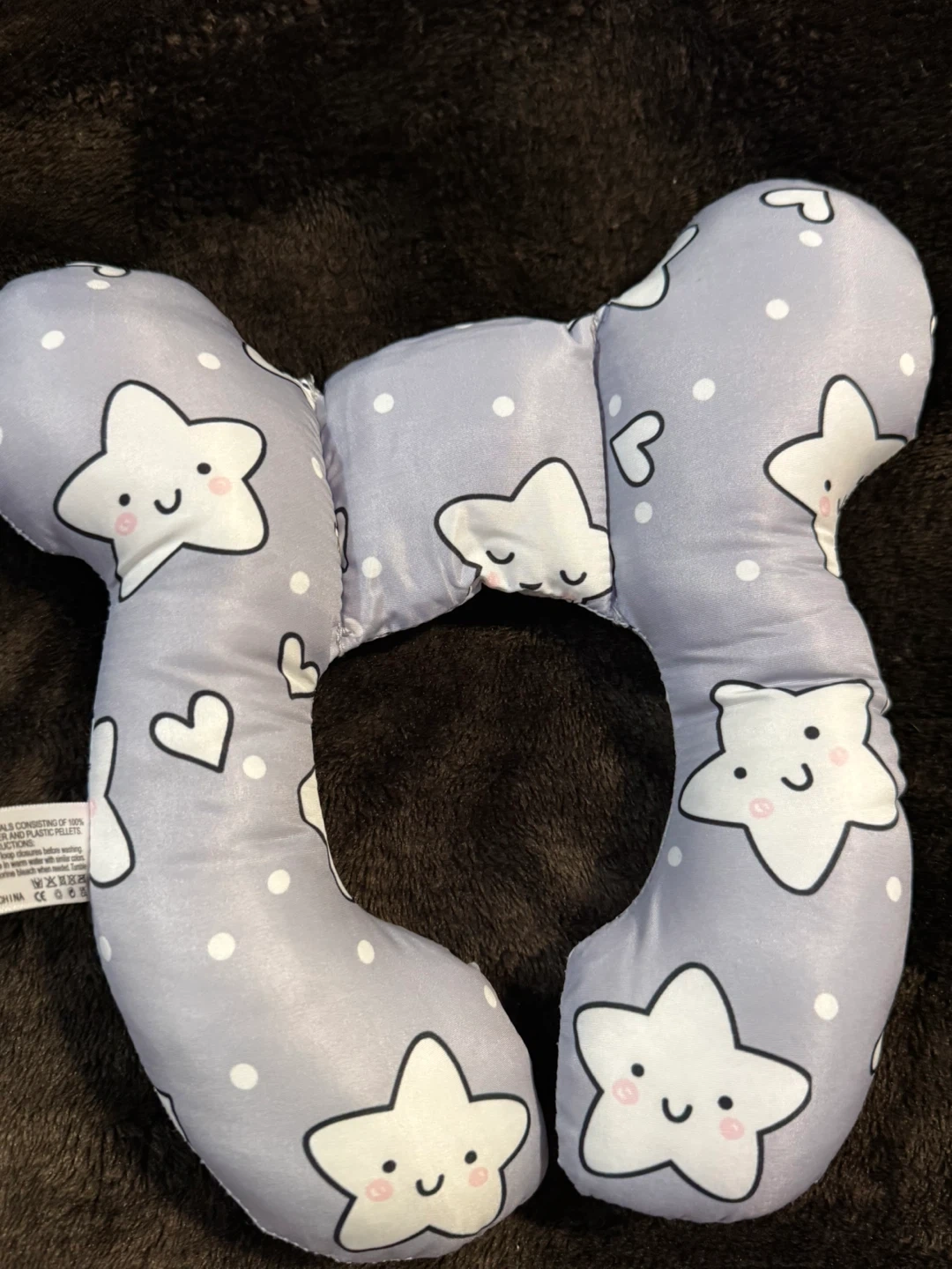 70Keep your little one comfy with this Kakiblin baby head and neck support pillow! It's designed to provide gentle support and features a cute star and heart pattern on a soft, grey fabric. Perfect for car rides or stroller walks to keep your baby snug and secure