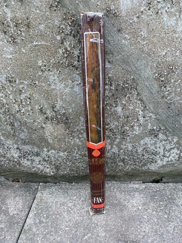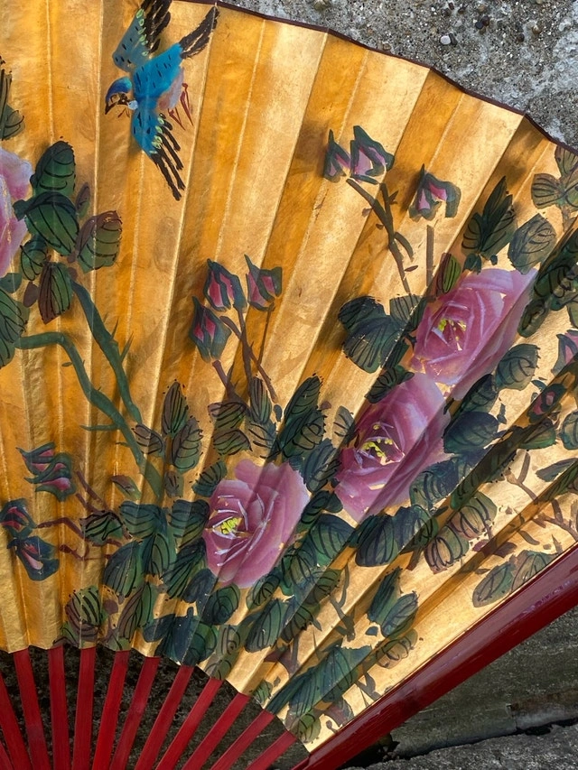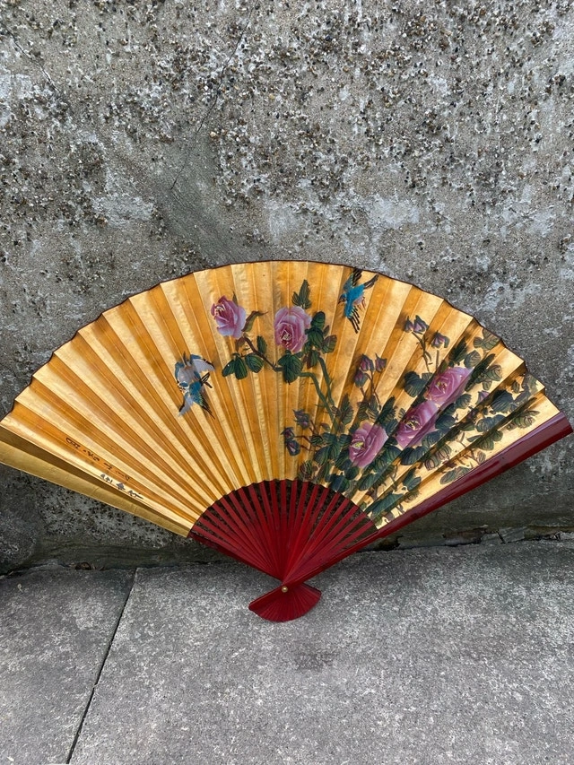 This beautiful Shandong Corporation Decoration Fan is in used condition, though it remains a captivating piece of art. The fan features intricate floral and bird designs on a golden backdrop, complemented by elegant calligraphy. Perfect for collectors or as a unique decorative item. The original packaging is included, though it shows wear. Brand: Shandong Corporation. Origin: Made in China. Design: Floral and bird motifs with calligraphy. Dimensions: 35” x 58”. If the ad is up, the fan is available. Cash accepted.