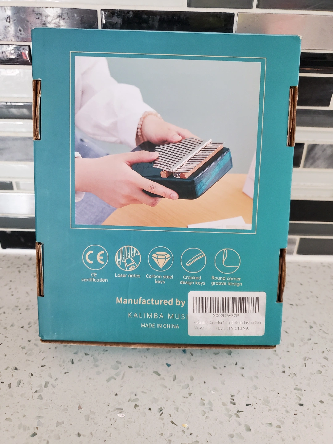 Selling a Kalimba thumb piano! It features laser notes and carbon steel keys. Also has a crooked design and round corner groove design. Great for anyone interested in learning a new instrument! Comes with the original box