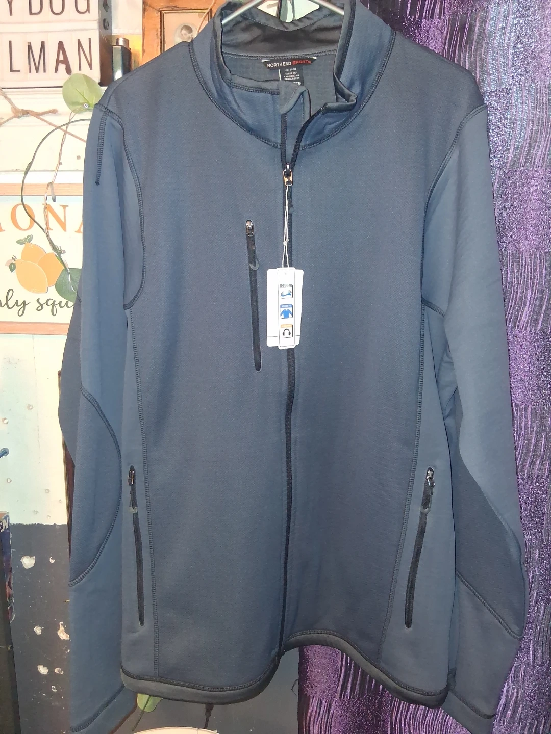 ABSOLUTELY BRAND NEW WITH TAGS STILL ATTACHED. This is a North End Sport full zip jacket in a dark blue colour. It features multiple zippered pockets and a soft fleece-like interior. It's a size large