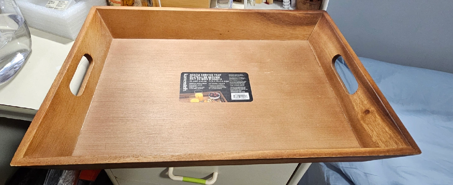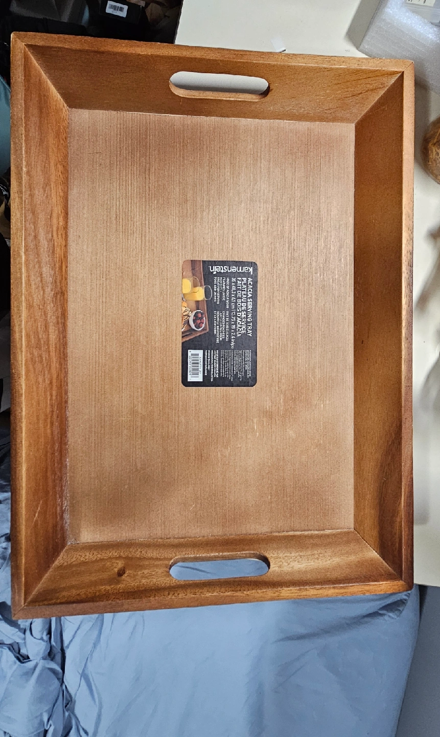 This is a Kamenstein Acacia Serving Tray. It's perfect for serving drinks or snacks. The tray is made of acacia wood and has a natural finish. It is a stylish and functional addition to any home