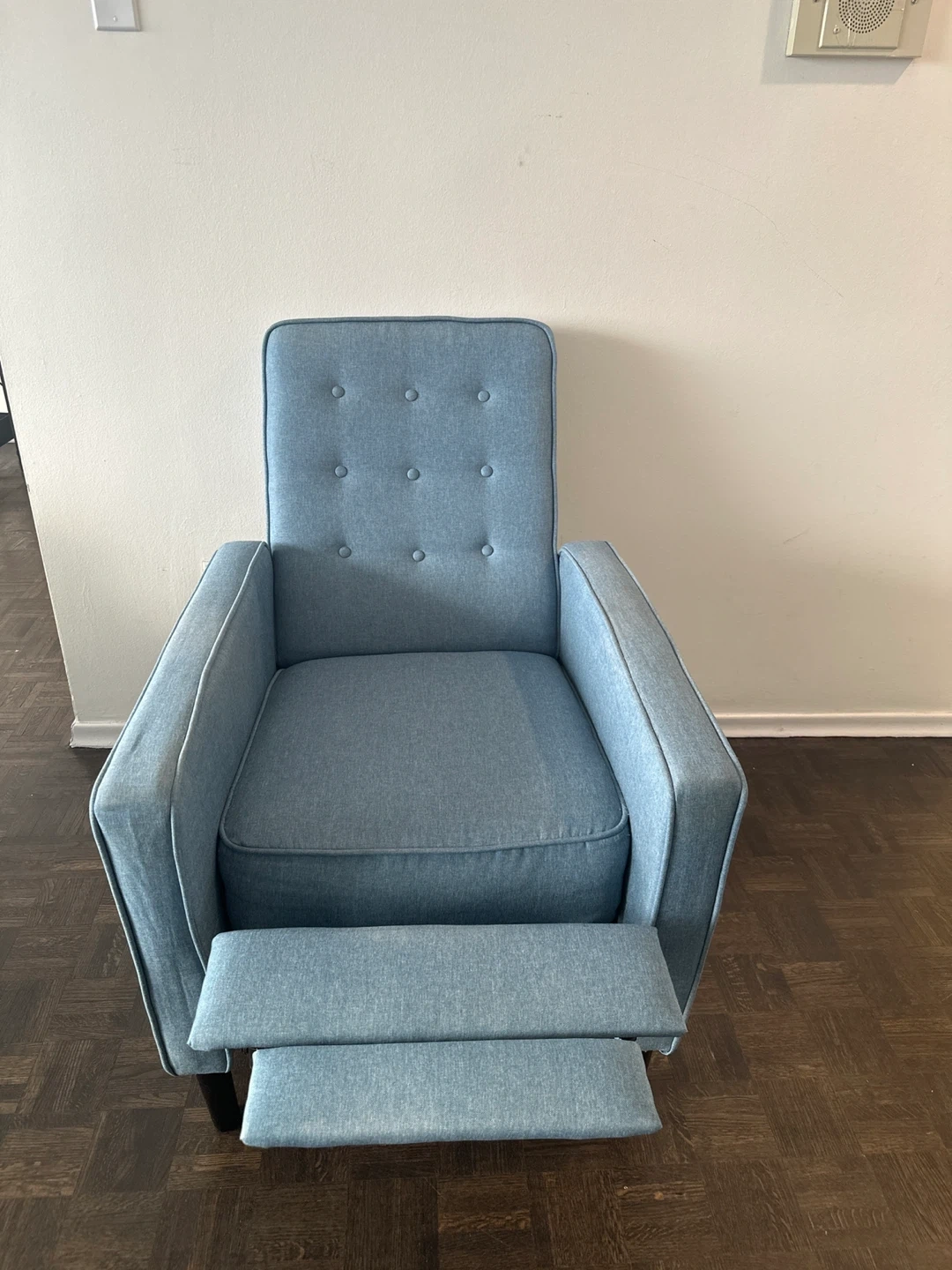 Comfortable blue recliner chair / armchair with a built-in footrest. Tufted back and sturdy design. It's made of durable fabric. It can be easily dismantle if needed for transportation and fits in small car if dismantled.