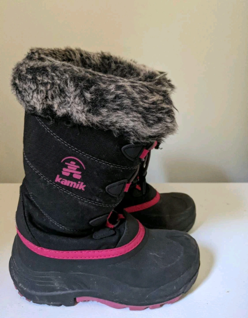 Cozy Kamik winter boots in black with pink accents and faux fur trim! Great for keeping little feet warm and dry during Canadian winters size 1