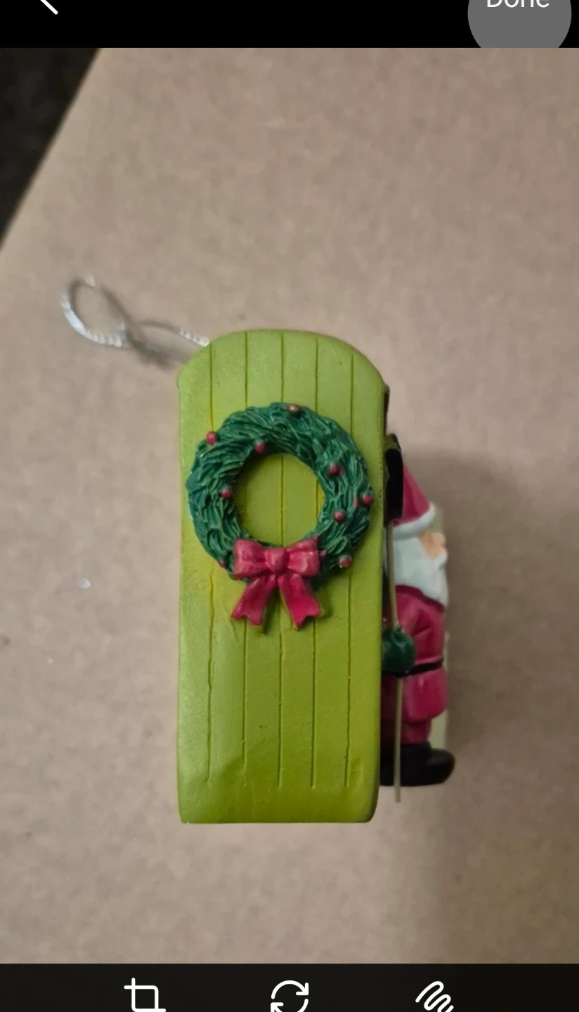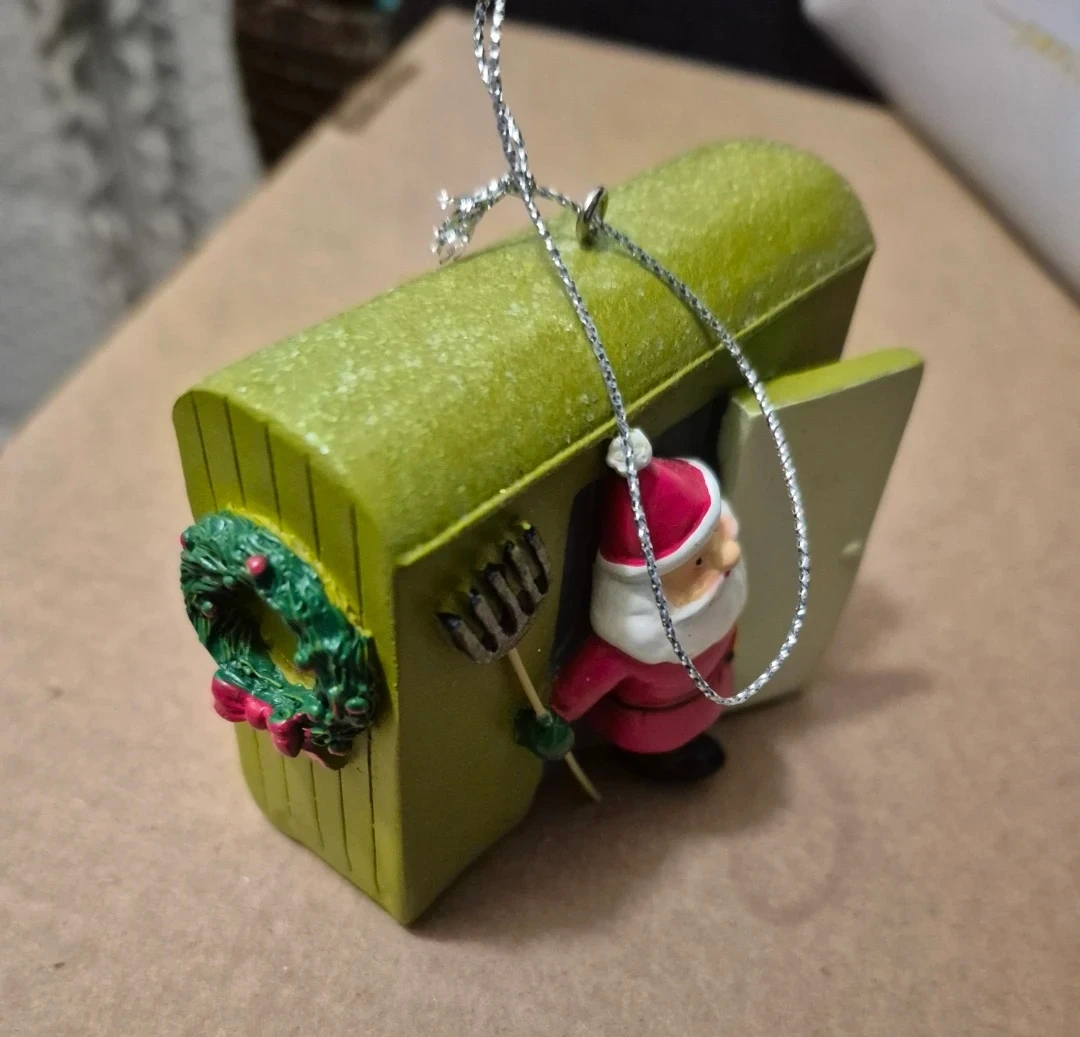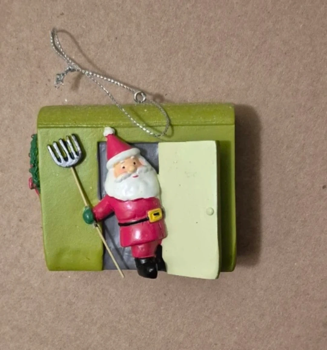 This fun Christmas ornament features Santa Claus holding a pitchfork! It's a unique addition to your holiday tree.